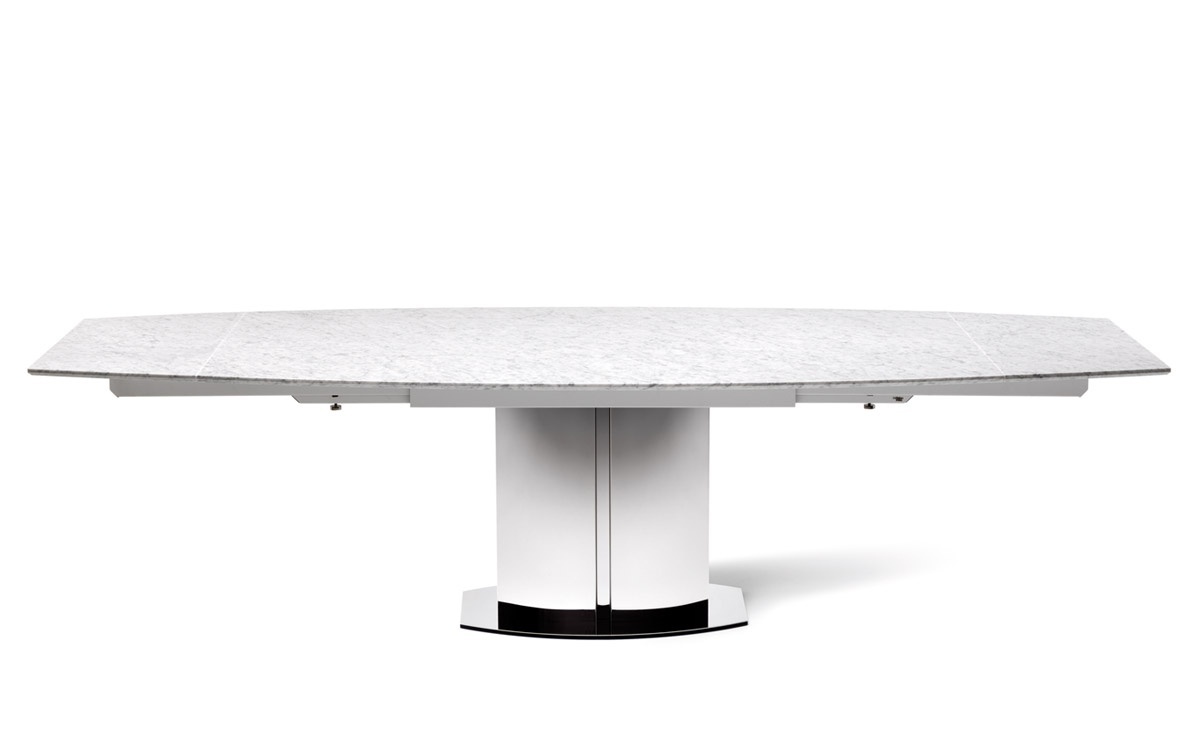 Dining table Rodeo Drive Marble from the Italian manufacturer Cattelan Italia. Extending table with glossy stainless steel. Countertop and sliding parts of white Carrara marble. The model is made in modern style. Colours in stock.