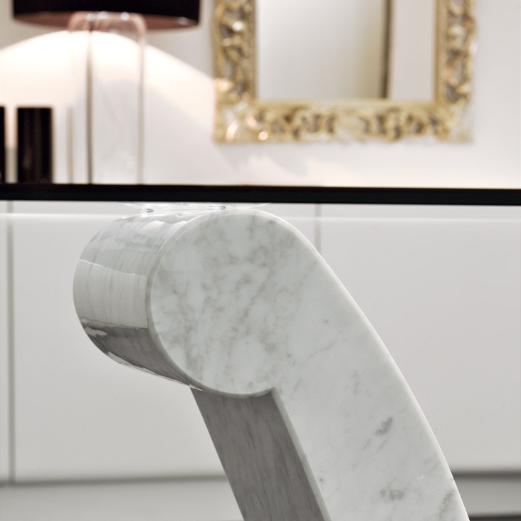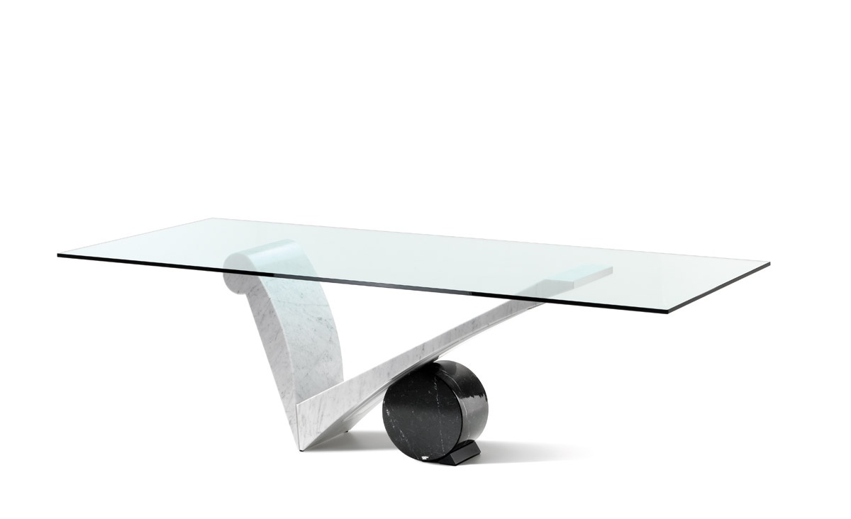 Dining table Viola D'amore from the Italian manufacturer Cattelan Italia. Table with base in white Carrara marble and cylinder in Travertine, white Carrara marble, black Marquinia marble. The tabletop is made of transparent glass 15 mm. the Model is made in modern style. Colours in stock.