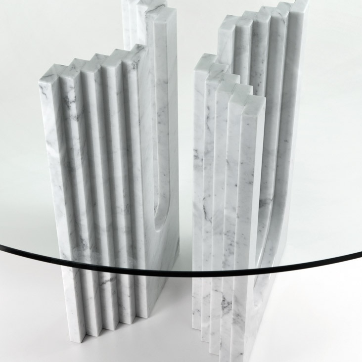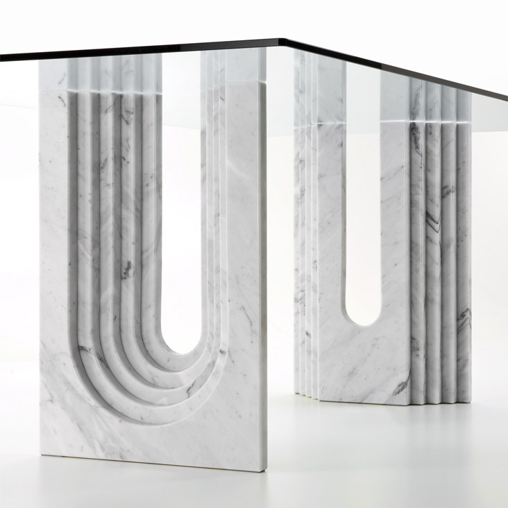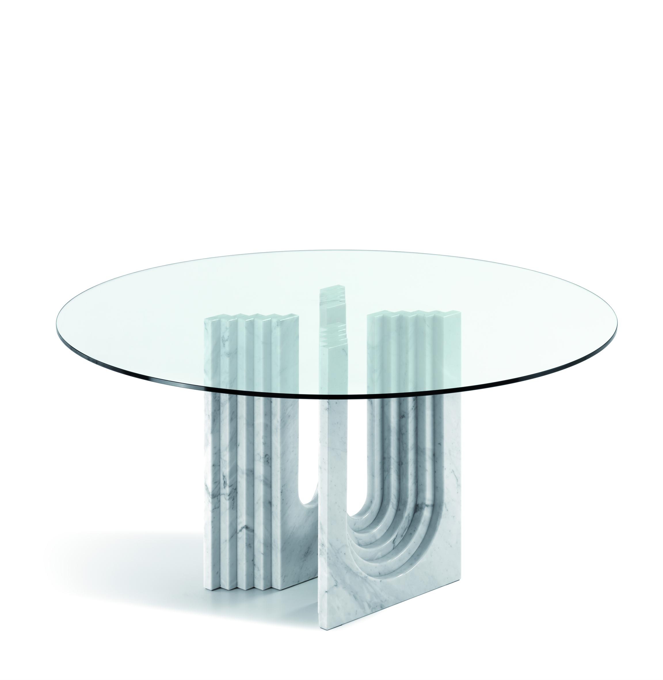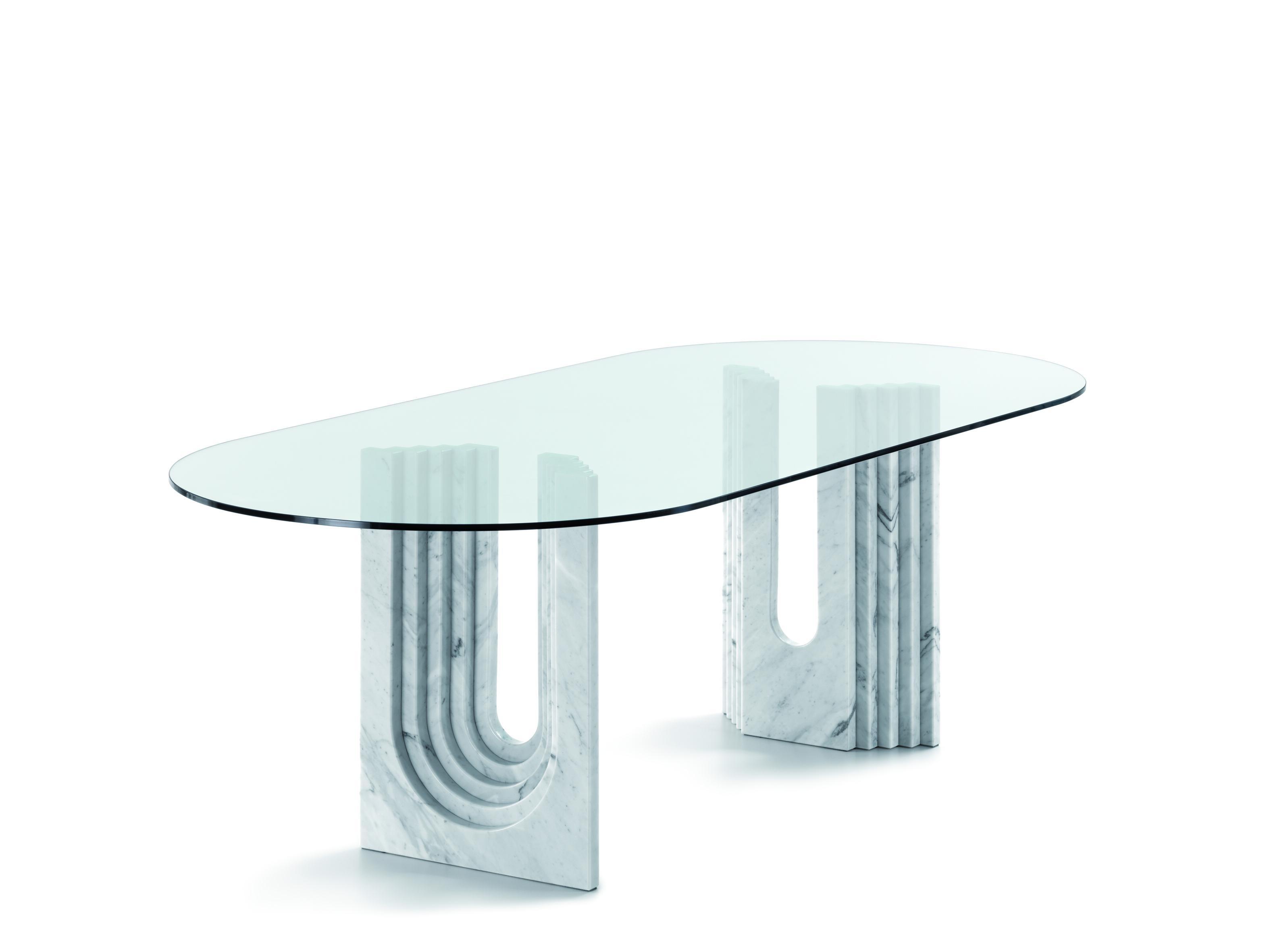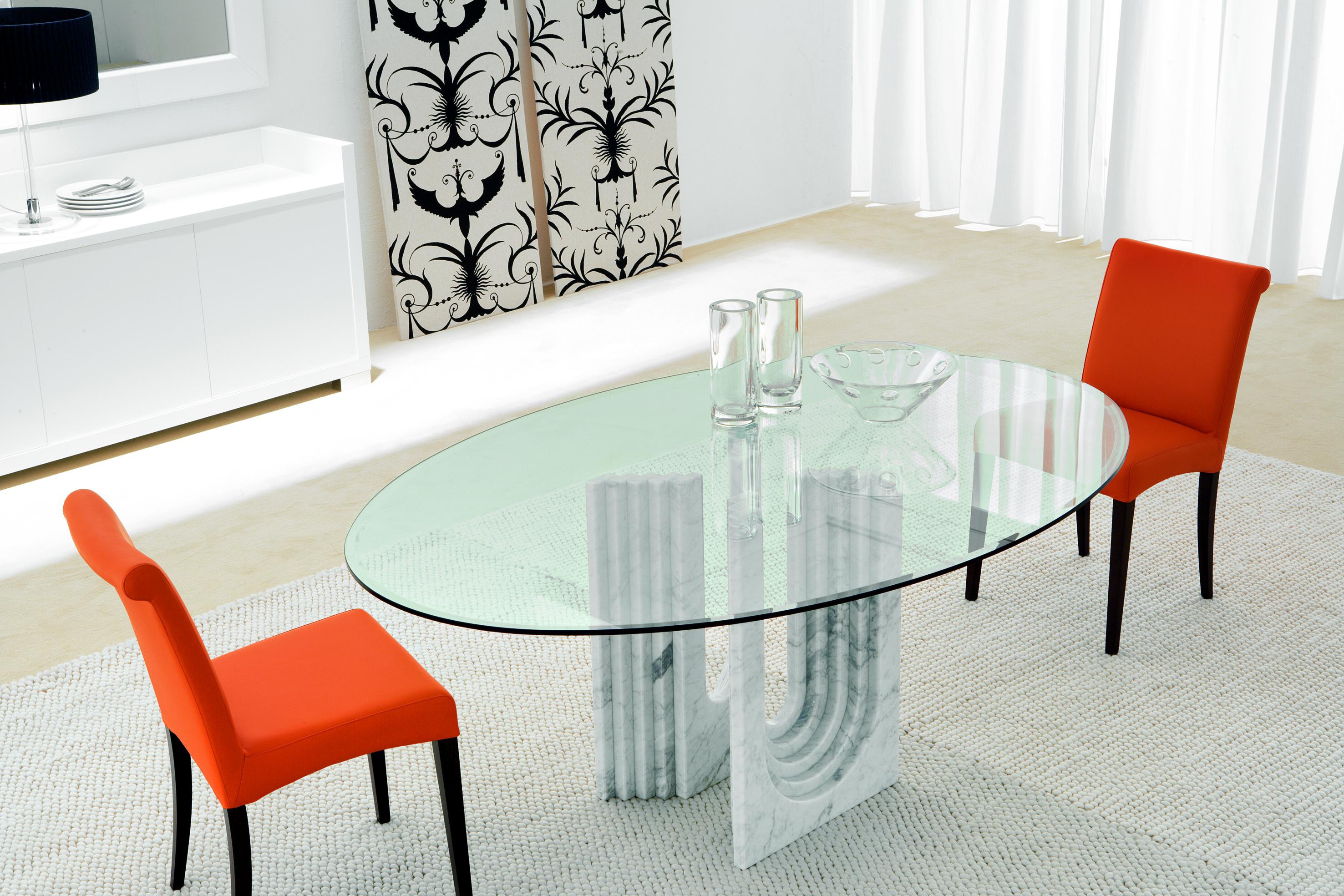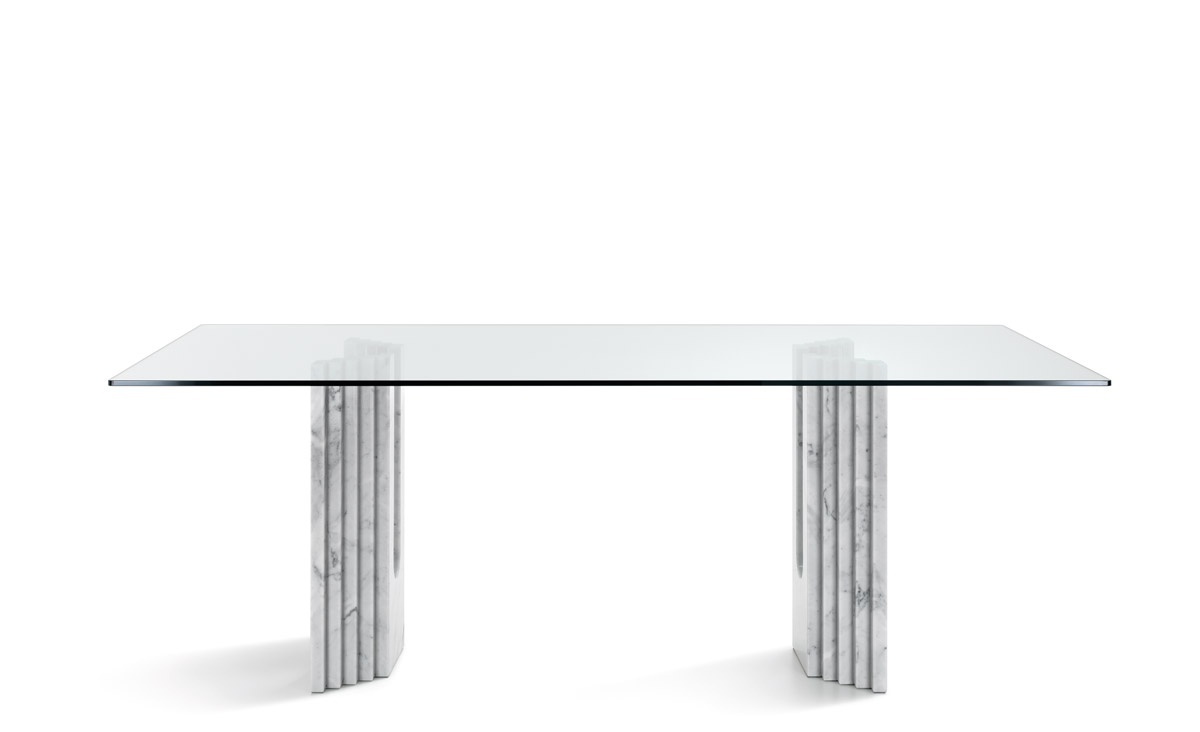 Naxos dining table from Italian manufacturer Cattelan Italia. Table with base in Travertine or white Carrara marble. The tabletop is made of transparent glass 15 mm. the Model is made in modern style. Colours in stock.