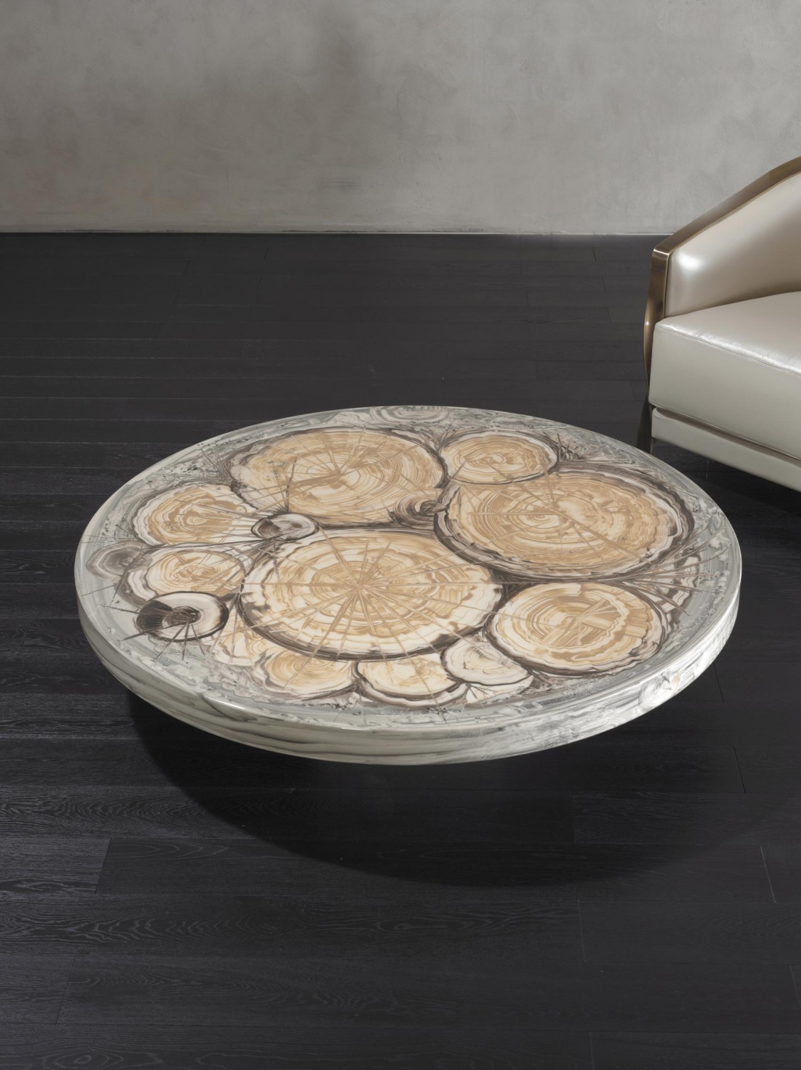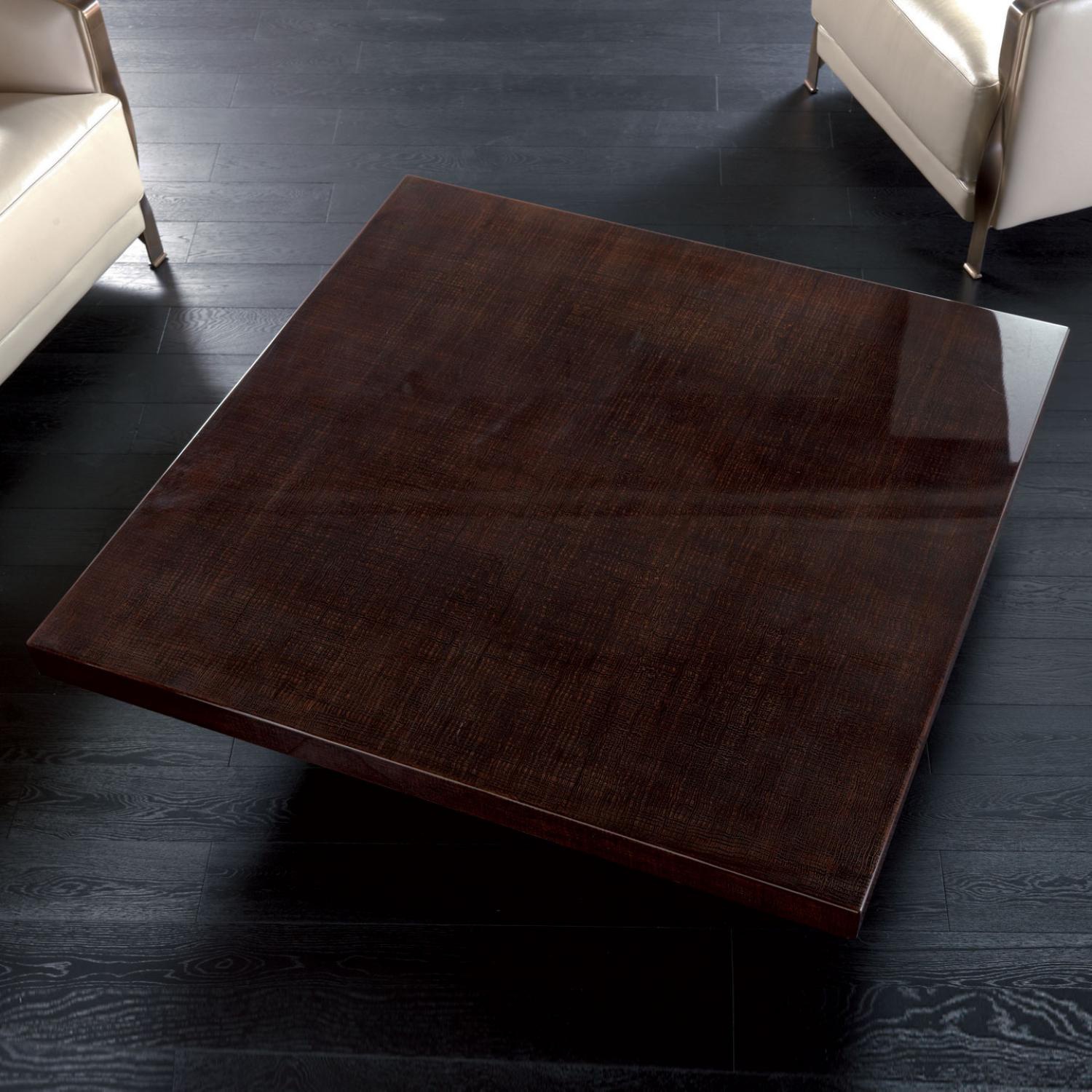 Coffee table from Decoro Italian manufacturer Rugiano. The base of the table is made of wood and varnished. The tabletop is square shaped, the factory offers two sizes. Leather, or patterned. Color to be selected from the manufacturer's catalogue.