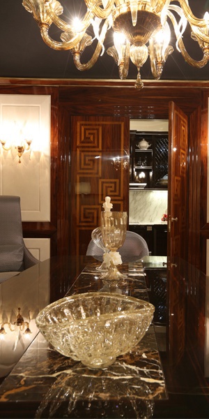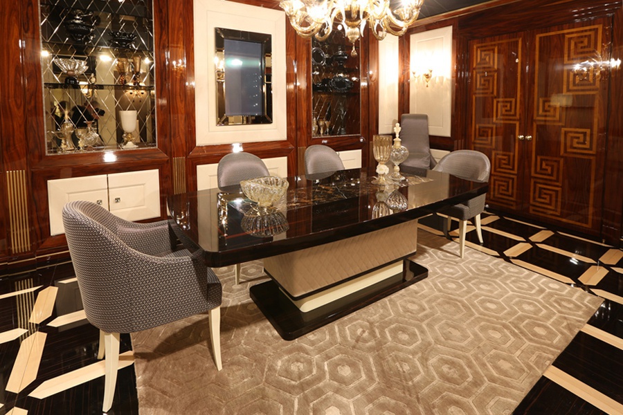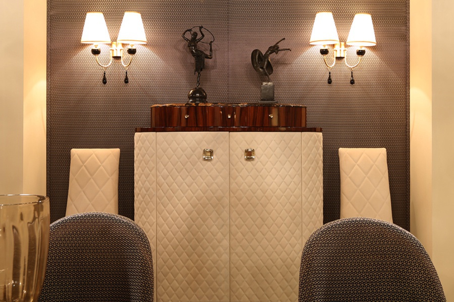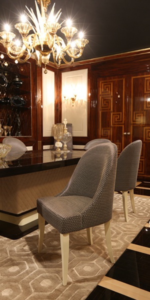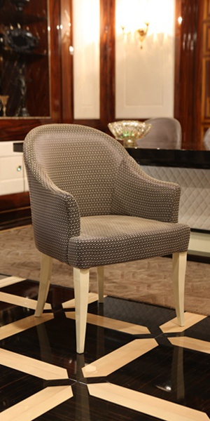 Dolcevita set for the dining room from Italian manufacturer Minotti Collezioni. Consists of a dining table, armchairs and wardrobe. The models are made from valuable breeds of wood. The frames are covered with high gloss varnish. Seats and seat backs upholstered in textiles from the company portfolio. Accessories - bronze.