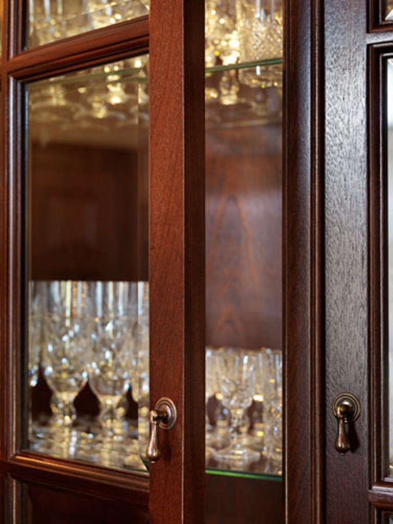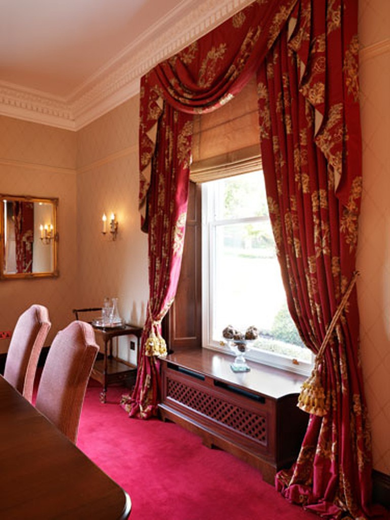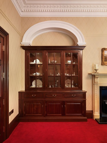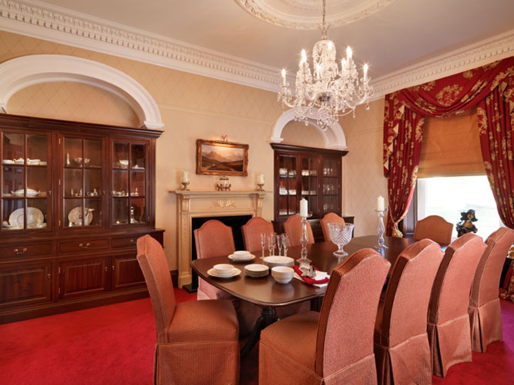 Set for the dining room from the English manufacturer Charles Yorke. Set includes: rectangular dining table with rounded corners, chairs with high back, window and cupboard. The frames are made of wood. Upholstery - textiles red. The window - glass. The finishing - varnish. Set is made in a classic style. Create a pleasant environment to dine and be entertained.