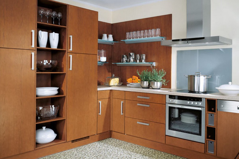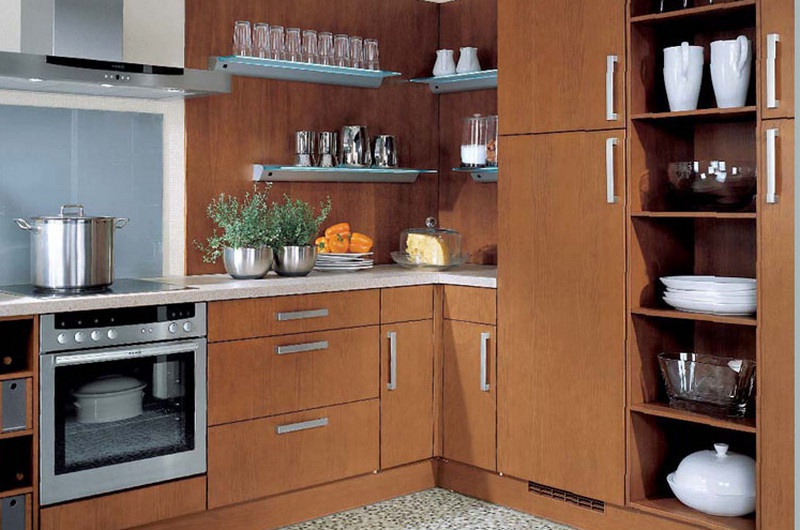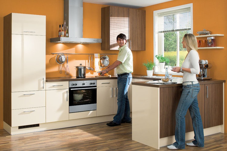 650 Salerno kitchen cabinets from German manufacturer Bauformat. Furniture material: shponirovannye tree. You can appreciate how gorgeous it looks on the example of the combined facades of white, and also vanilla and glossy natural tones of oak. Elements of contemporary design are successfully combined in "speed" separately allocated area, and at an angle thereto are the sink and hob.Modern style with classical elements.