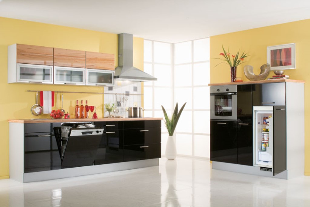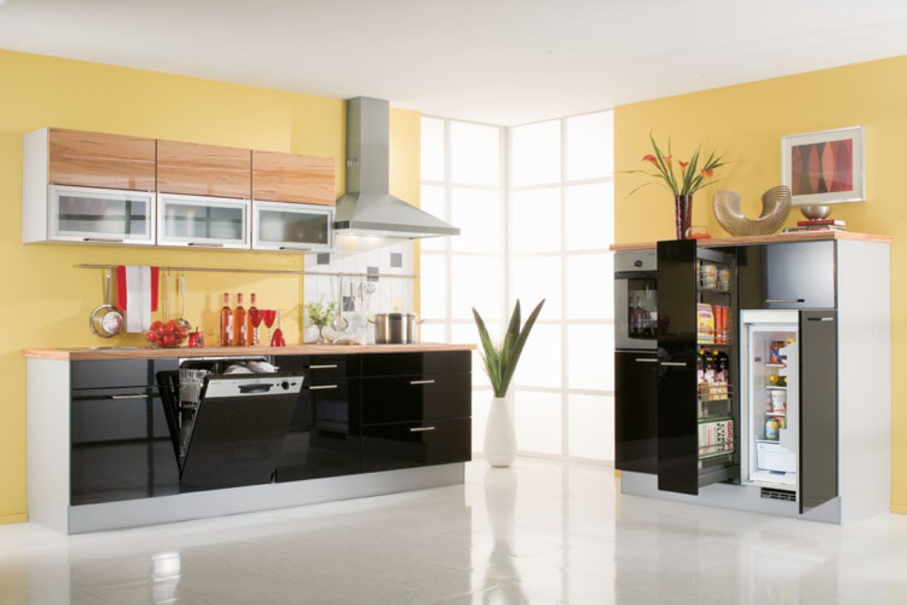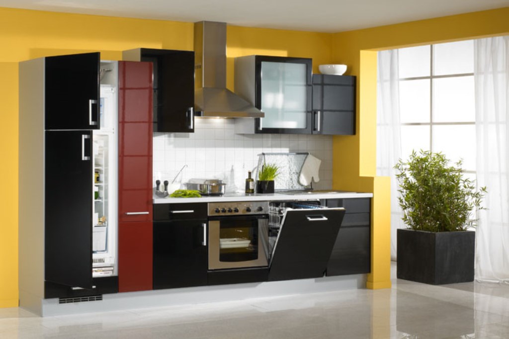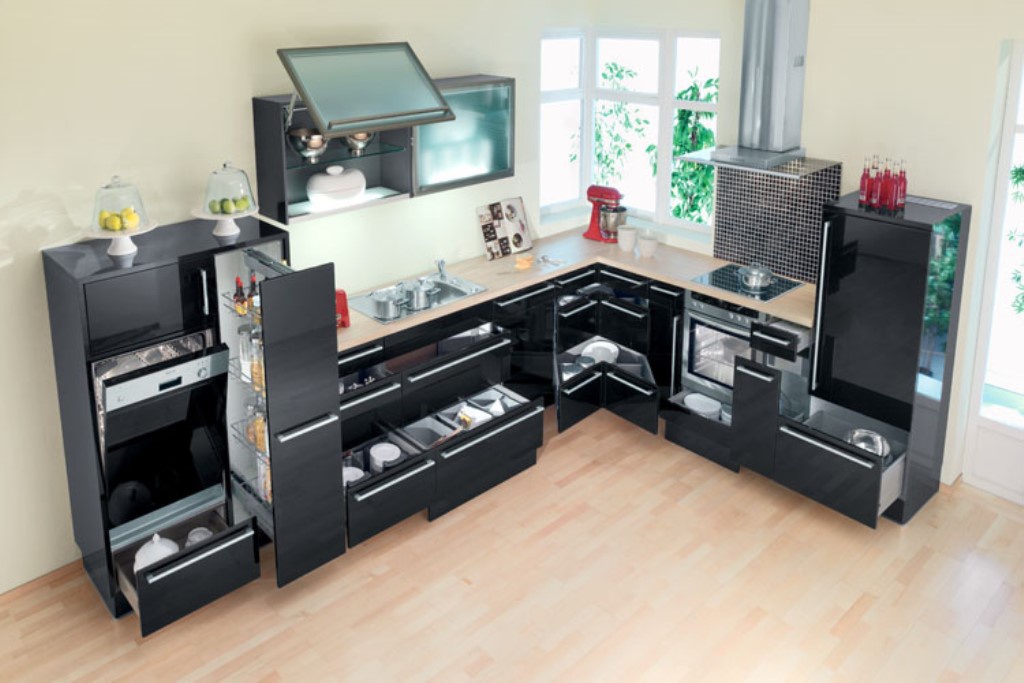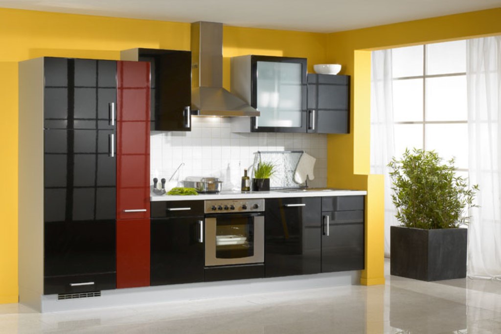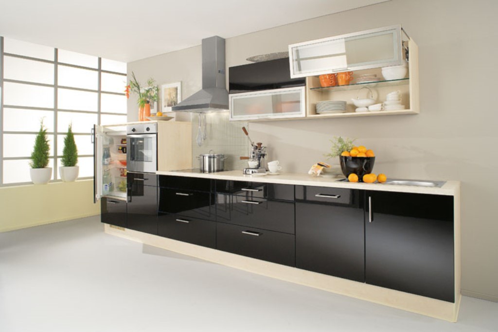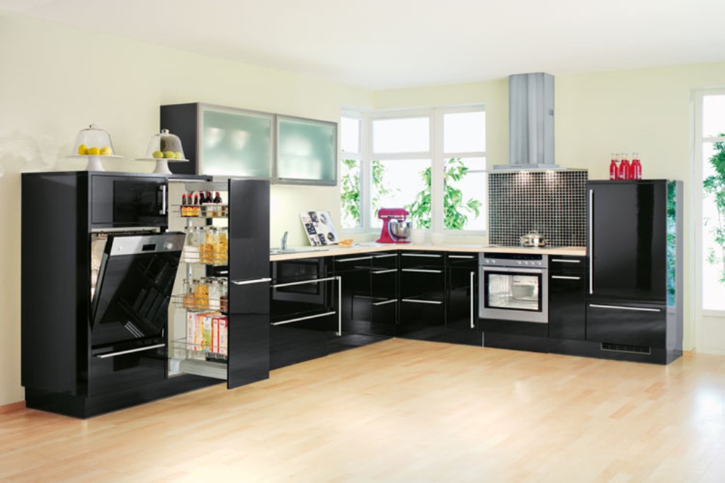 Kitchen cabinets Colorado 311 of the German manufacturer Bauformat. Materials used - MDF, solid wood. The kitchen is designed in modern style. The kitchen is created on the basis of black shiny facades. The whole line fronts lacquer; we invite You to enjoy a variety of dishes with black facades in combination with bright colors, color Burgundy wine, and light wood. I think You will notice how super-modern look the kitchen is fully composed of black fronts, set off by how light and spacious the kitchen is in classic style with the mix of light and how bright shades play shades of coral and red wine colour.