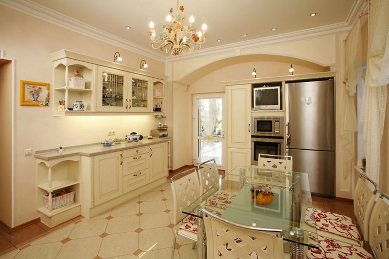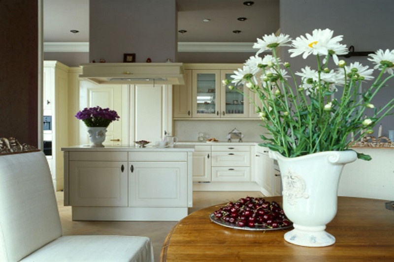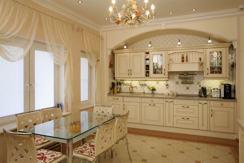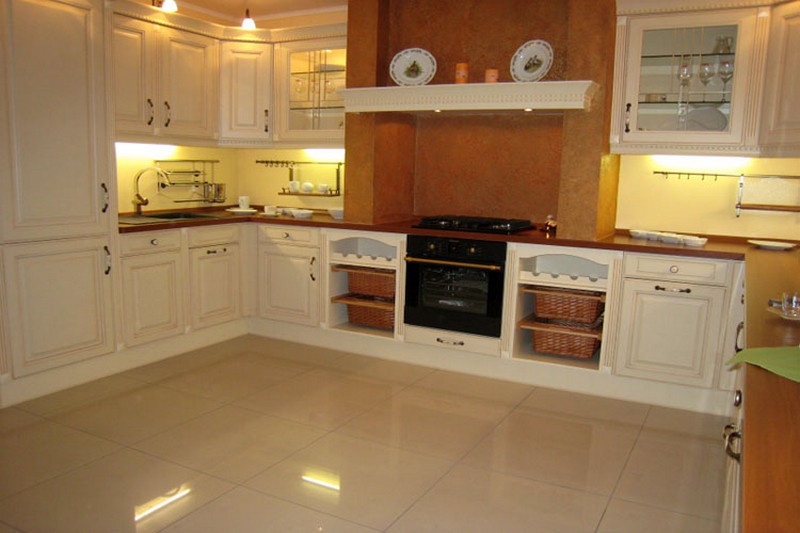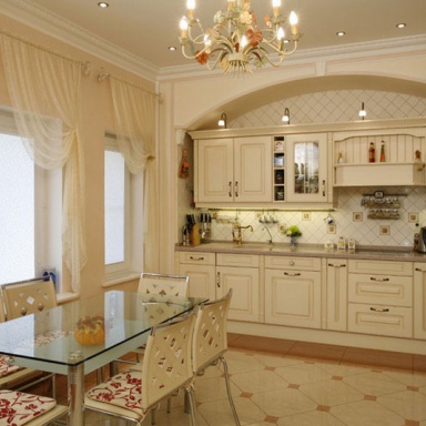 Nevada 557 kitchen from the German manufacturer Bauformat. Used materials: solid wood - body; granite table top; glass table cover; plastic chairs. Luxury German kitchen in the ever-popular classic style with modern equipment.