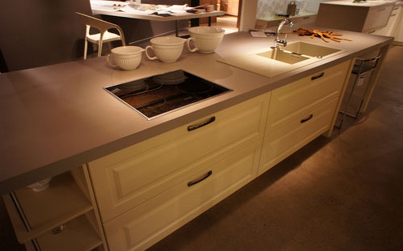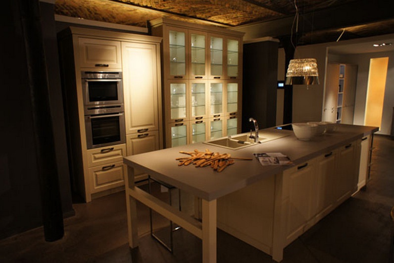 Kitchen Sevilla 595 from the German manufacturer Bauformat. Made of natural wood: array and DSP. This classic kitchen island is present the location of countertops, combo of cream facades, stained glass for cabinets as well as the latest household electrical wiring, located as comfortable as possible for Housewives.