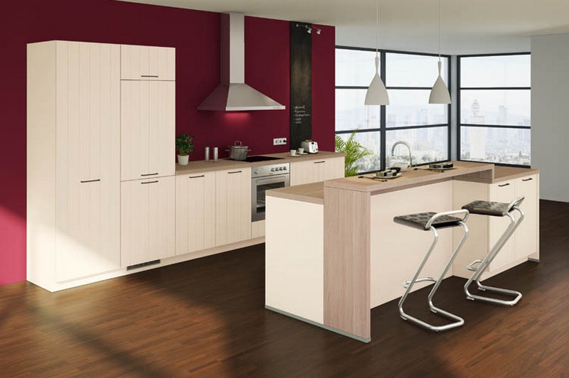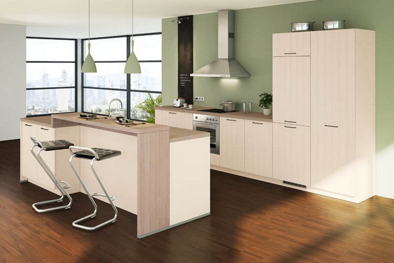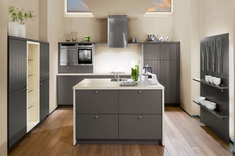 Kitchen Nizza 329-331 from the German manufacturer Bauformat. The furniture in modern style, fronts made of MDF presented in 2 colors: vanilla and graphite. Interesting solutions for cabinets - hung internal shelves, the facades are made of durable and modern materials.