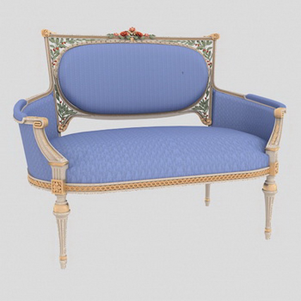 Chair American manufacturer of Barbara Barry. Presents double seat on a frame of solid beech. The filler is polyurethane foam, upholstery textiles blue. Decorated with handmade carving. The model is perfect for living room or hall.