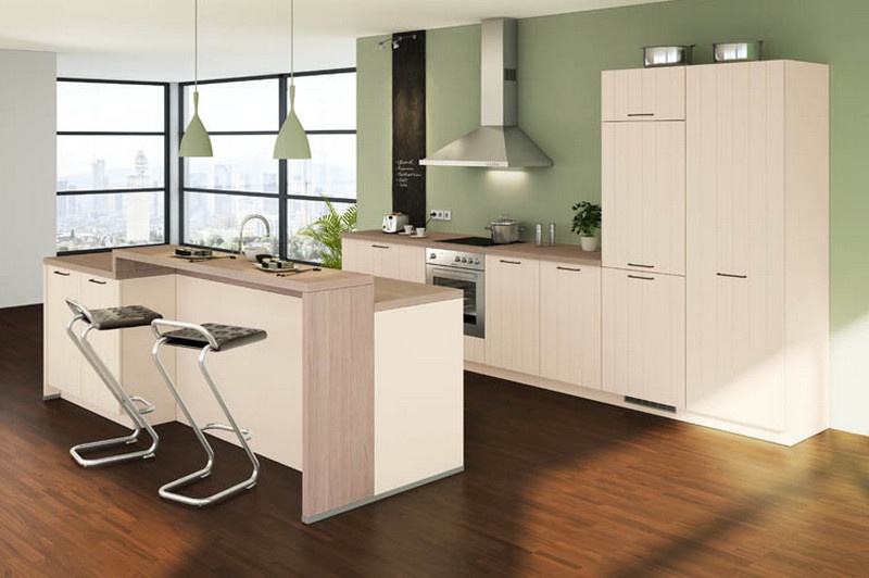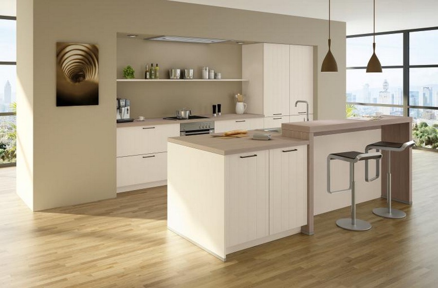 Kitchen Nizza 329 from the German manufacturer Bauformat. Kitchen in classical style, facades of MDF presented in a vanilla color version. Interesting solutions for cabinets - hung internal shelves, the facades are made of durable and modern materials.