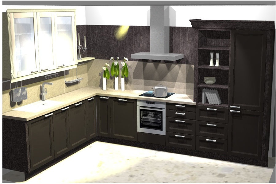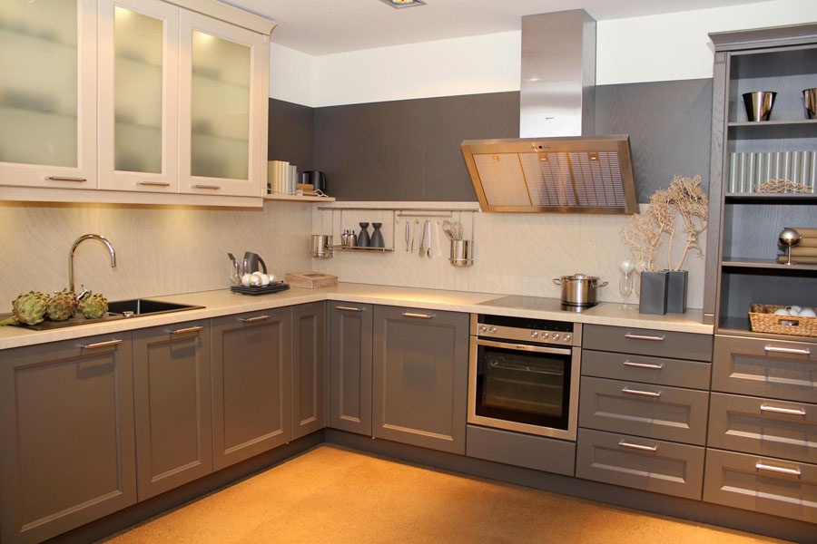 Kitchen Grenada 685-FG 412 from the German manufacturer Bauformat. Classic German food and is embodied in the design solution - convenient drawers and shelves veneer countertop - array, all necessary furniture and modern equipment. The combination of the facades in two colors (beige and ash) makes this classic kitchen harmonic completeness, "apron" made of wall panel that becomes a countertop.