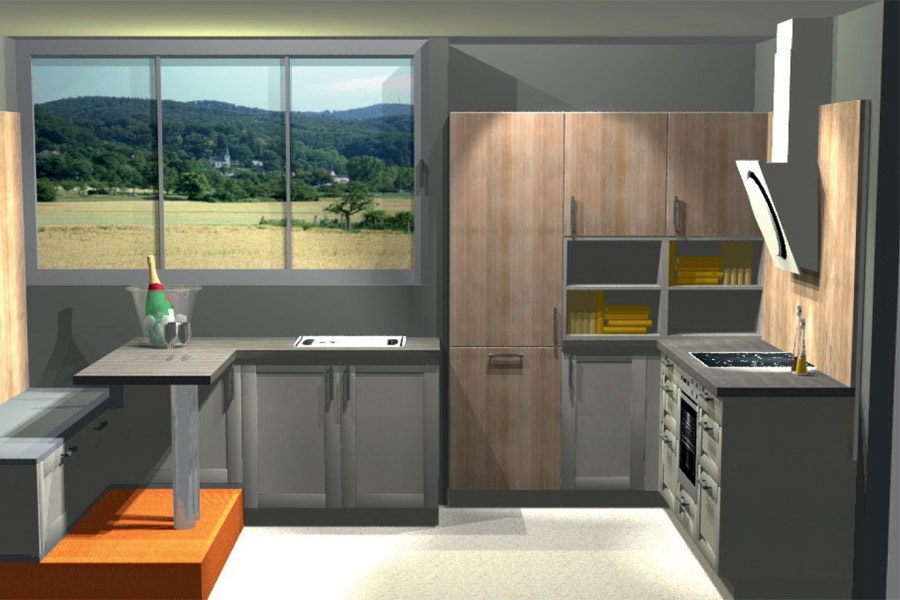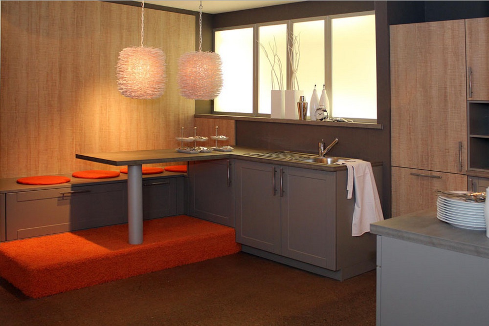 Kitchen Genua 523 from the German manufacturer Bauformat. In the basis of natural wood: solid. Unusual interpretation of modern style. For example, this cuisine one can see the meticulousness of the work the company Bauformat. Covers and doors and drawers can be performed not just unusual, but almost a millimeter step. Dining area is placed on the podium custom shop standard cabinets and table on one leg as a continuation of the countertop