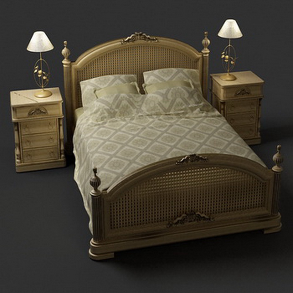 Set for bedroom Imperio American producer Barbara Barry. Set consists of a double bed and bedside cabinets. The frame is made from solid wood and rattan. Finish lacquer beige. Originality gives the bed a high headboard and footboard of figure form with decorative elements. Upholstery textile with ornament. Wonderful selection in a classic style.