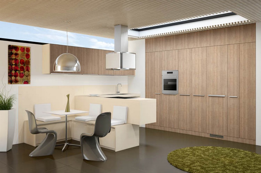 The Bergen 262 German kitchen manufacturer Bauformat. Materials used: natural wood, MDF. The combination of beige colors of the natural wood creates a warm, relaxed atmosphere. The location of the dining area, the chic design features, attributes, cuisine emphasize the unusual style of modernized furniture.