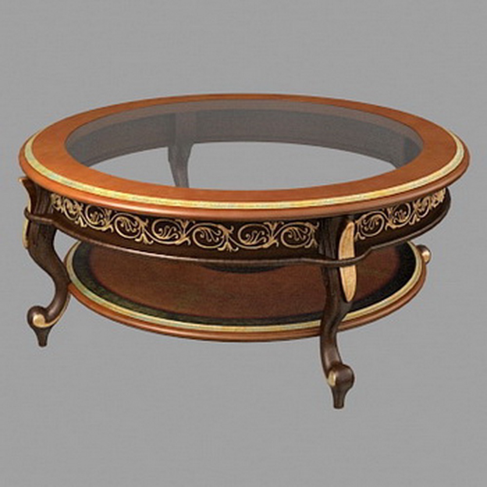 Coffee table from American producer Barbara Barry. The frame table is round, made of solid wood on four figural legs varnished. Table top glass wood framed. The model will surely embellish your living room.