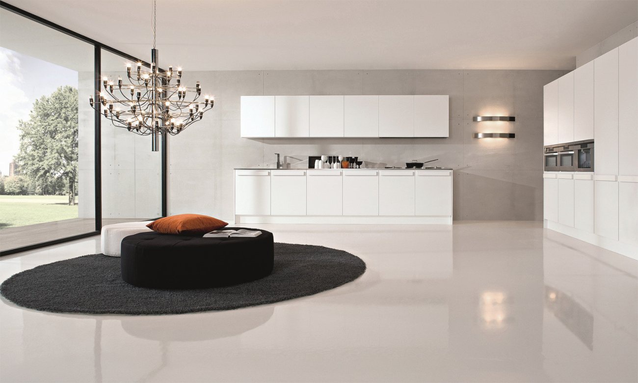 City kitchen by Italian manufacturer Doimo Cucine. Model in the style of minimalism. Made of wood and MDF. Facades of laminated or lacquered in different colors. Built-in appliances. Worktop can be made of: artificial stone, stainless steel and glass, including solid wood. Colours in stock.