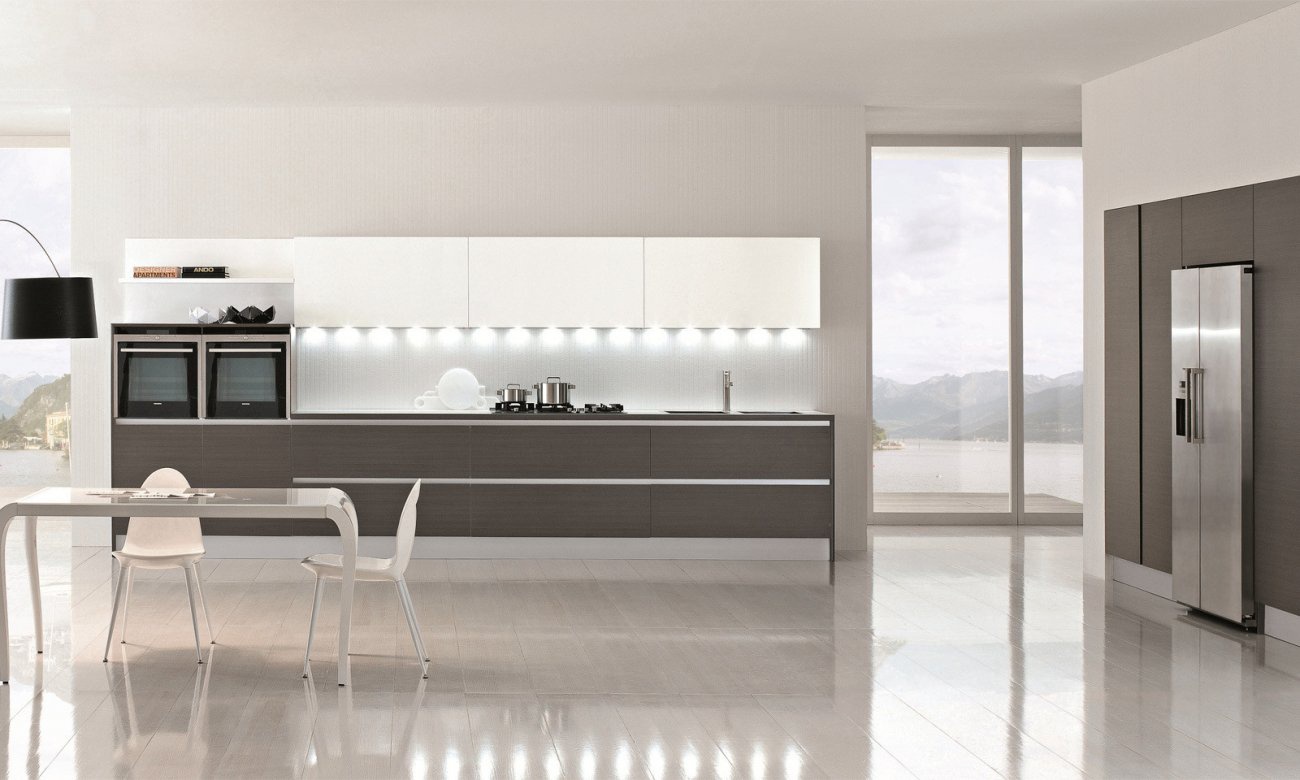 The Easy kitchen from Italian manufacturer Doimo Cucine. The frame is made from wood, panel is MDF. Veneer made of plastic or wood veneer. Model with closed shelves with lighting. Fittings - metal. Hanging lockers lined in white. The modern kitchen is designed in modern style.