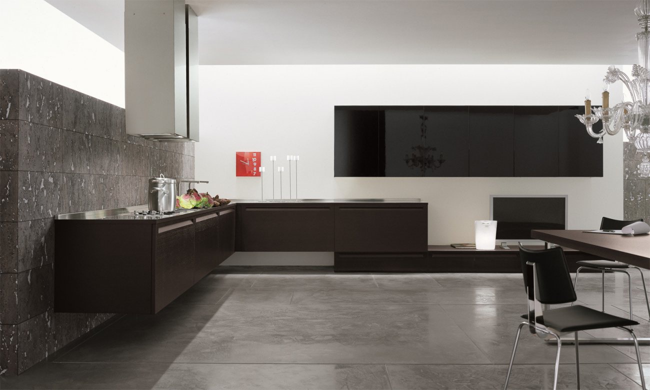 Extra kitchen by Italian manufacturer Doimo Cucine. The frame is made of MDF. Facades finishing with veneer or lacquer from the company portfolio. Wall cabinets with glass fronts. The table top is made of stainless steel or natural stone. Colours in stock.
