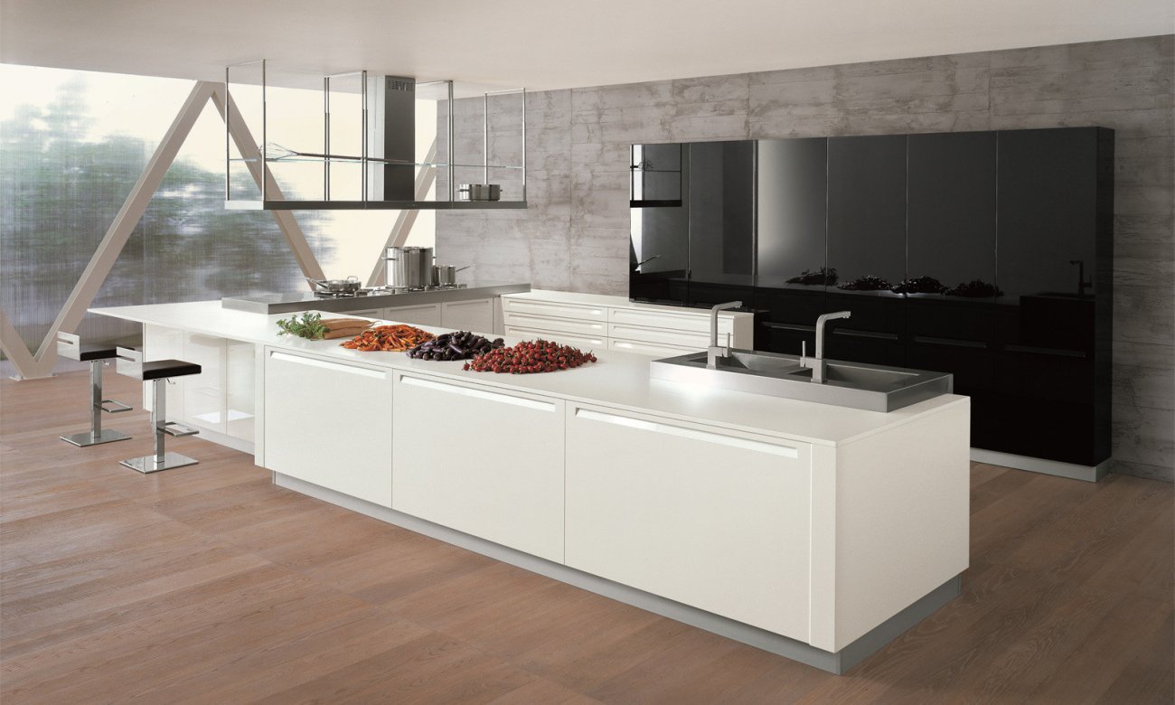 Extra kitchen by Italian manufacturer Doimo Cucine. Model with island and Breakfast bar. Frame and fronts are made of MDF. The glossy lacquer finish is offered from the company portfolio. Working surface covered with stone and stainless steel. The model is equipped with island cooker hood, and integrated appliances. Headsets are made in a modern style.