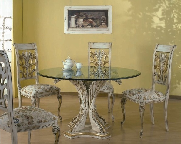 The chair is handmade from Italian producer Andrea Fanfani. Made from solid wood oak. The back is decorated with carving in the form of shoots with leaves, separate the elements highlighted in gilding, the surface is artificially aged, coated with a transparent substance, which protects it from damage. Upholstered seat in fabric with floral print.