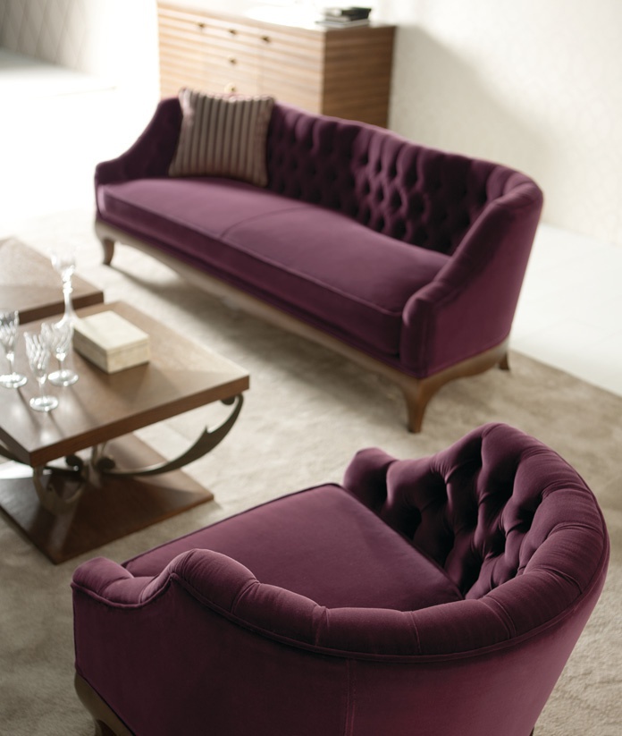 Margherita Classic sofa from Italian manufacturer Opera Contemporary. Model with low armrests and square seatback. Material - solid beech wood. Textile or leather upholstery to choose from a range of companies. The back is embellished with decorative buttons.