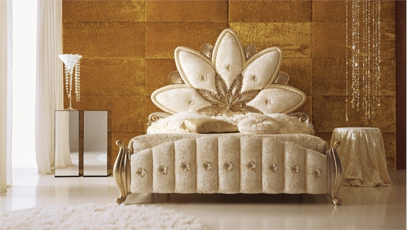 The Prive bed from Italian manufacturer Grilli. The frame is made of wood, upholstery - textiles from the company portfolio. Double bed with headboard in the form of a stylized flower. Model with decorative gold-plated legs - lacquered. Stylish bed for bedroom in the style of art Deco or the glamour. Colours in stock.