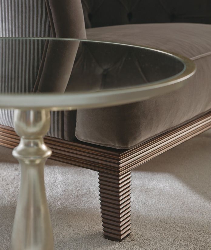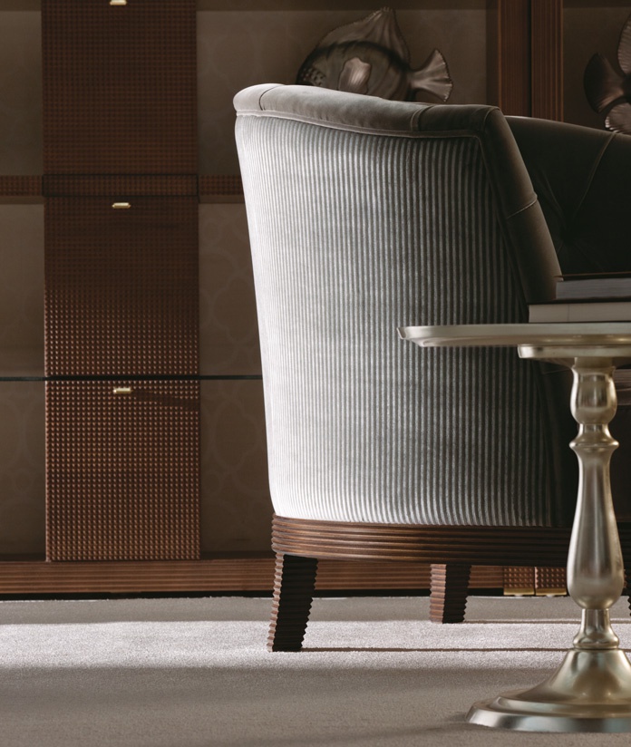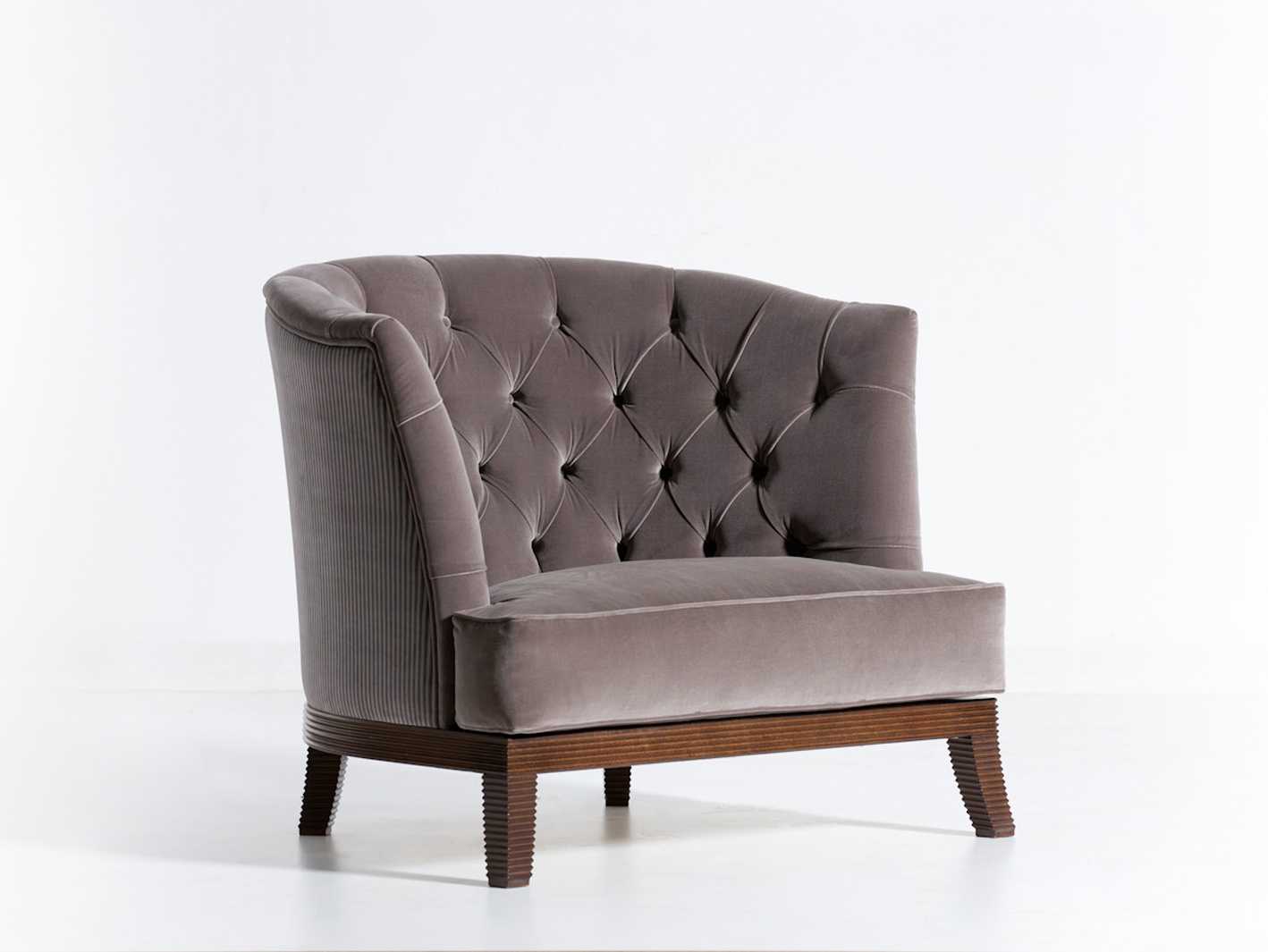 Parsifal Classic armchair from Italian manufacturer Opera Contemporary. The model is made in art Deco style. Legs made of solid beech wood. The finishing - varnish. Seat and back upholstered in fabrics or leather. Colors to choose from for the company directory. The back is decorated with ornamental stitch-Capito.