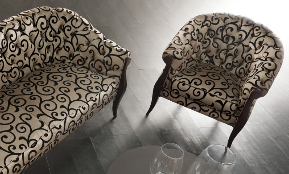 The Siebel Classic armchair from Italian manufacturer Opera Contemporary. The frame and legs made from solid beech wood tinted. Finish - gloss lacquer. Textile or leather upholstery to choose from a range of companies. The ornament serves as a decorative stitch-Capito.