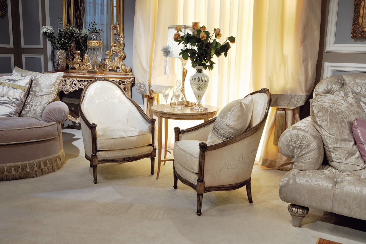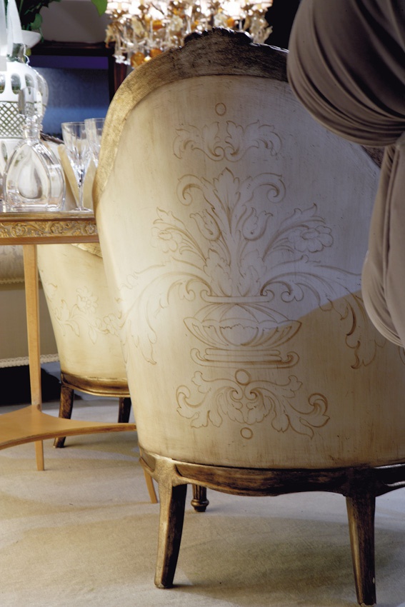 The Prestige armchair from Italian manufacturer Medea. The frame is made from solid natural wood. Seat and back upholstered in soft fabric or leather. On the underside of the trim strap. Legs and edge of the seat is decorated with handmade carving. The model is made in classic style.