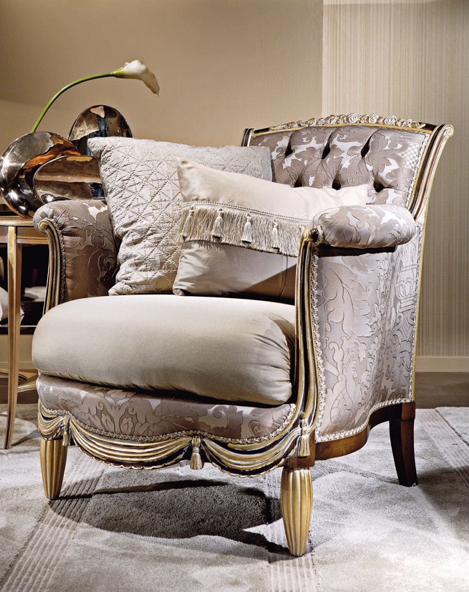 The Prestige armchair from Italian manufacturer Medea. The frame is made from solid wood. Seat and back upholstered in soft fabric flower ornament. The lower and upper strap decorated with handmade carving. The model is made in classic style.