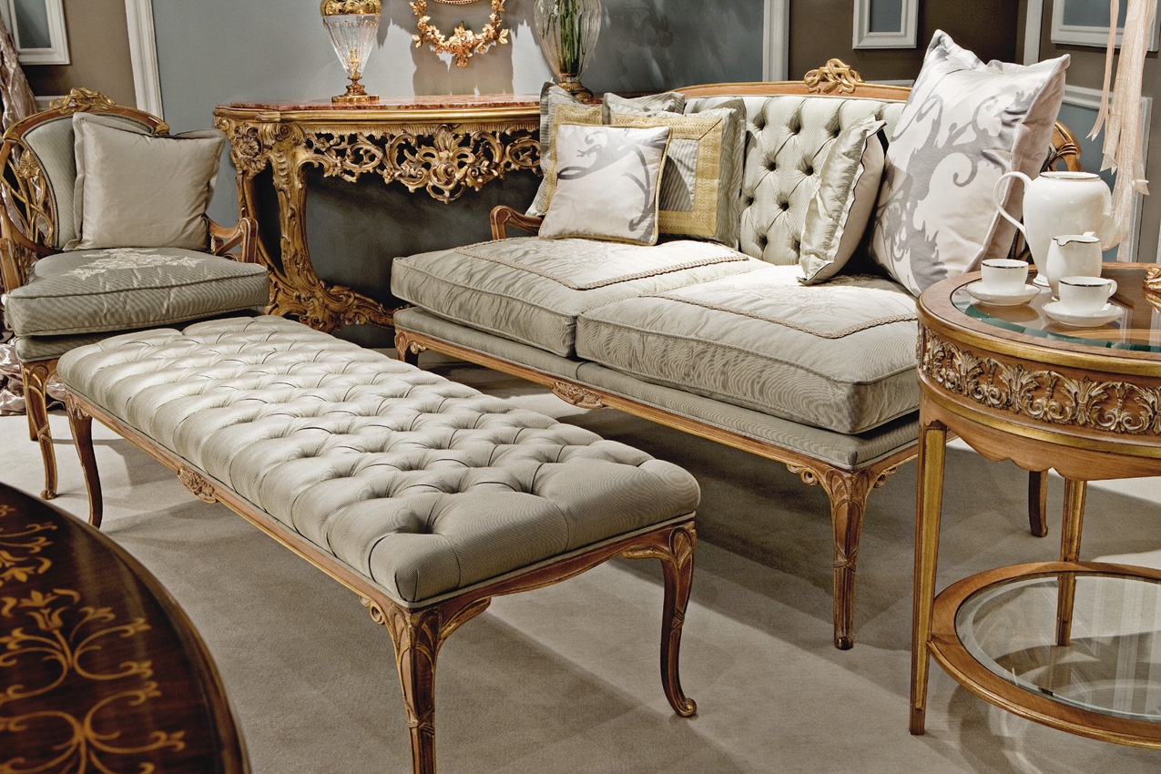 The Prestige sofa from Italian manufacturer Medea. Legs, lower and upper straps are decorated with hand carved and covered in gold. The model is upholstered with soft fabric in a diamond pattern. The model is made in modern style. Colours in stock.