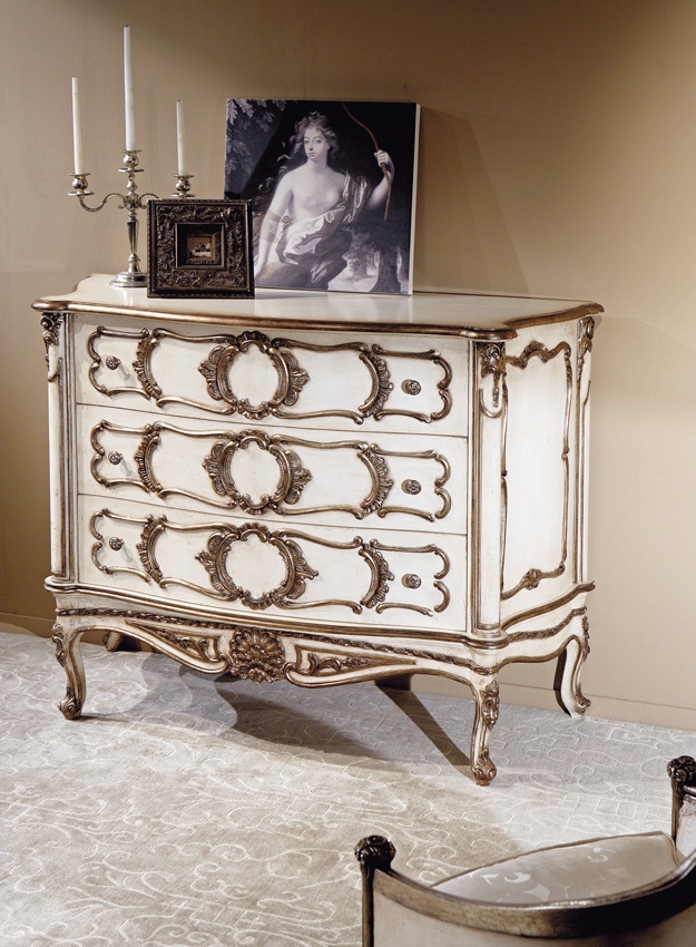 The Prestige chest of drawers from Italian manufacturer Medea. The model is made from natural wood. Dresser with three drawers decorated with hand-made carving and moldings with floral ornament. Fittings - metal. Great choice for the bedroom in classic style.