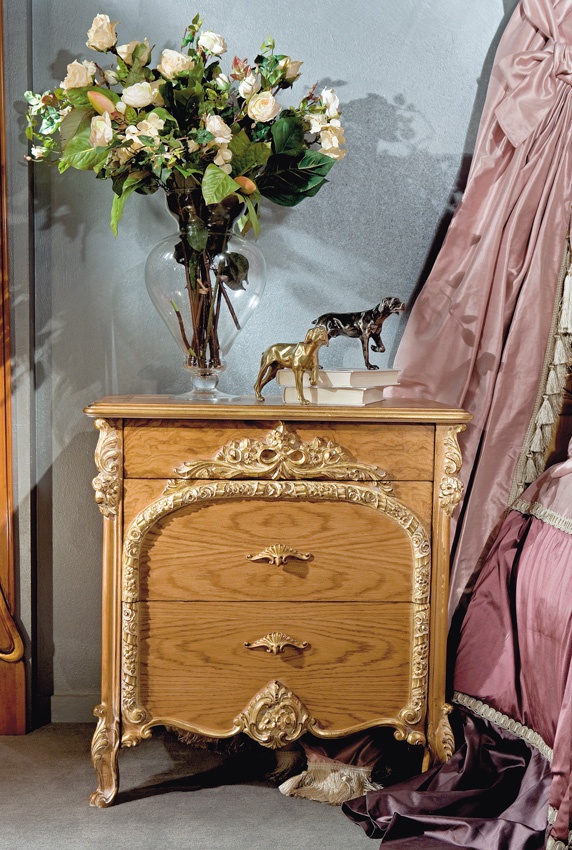Bedside table from Prestige Italian manufacturer of Medea. The frame is made from solid wood. The model is decorated with handmade carving. In the center of the overlay with floral ornament. The metal fittings. A perfect choice for bedrooms in classic style.