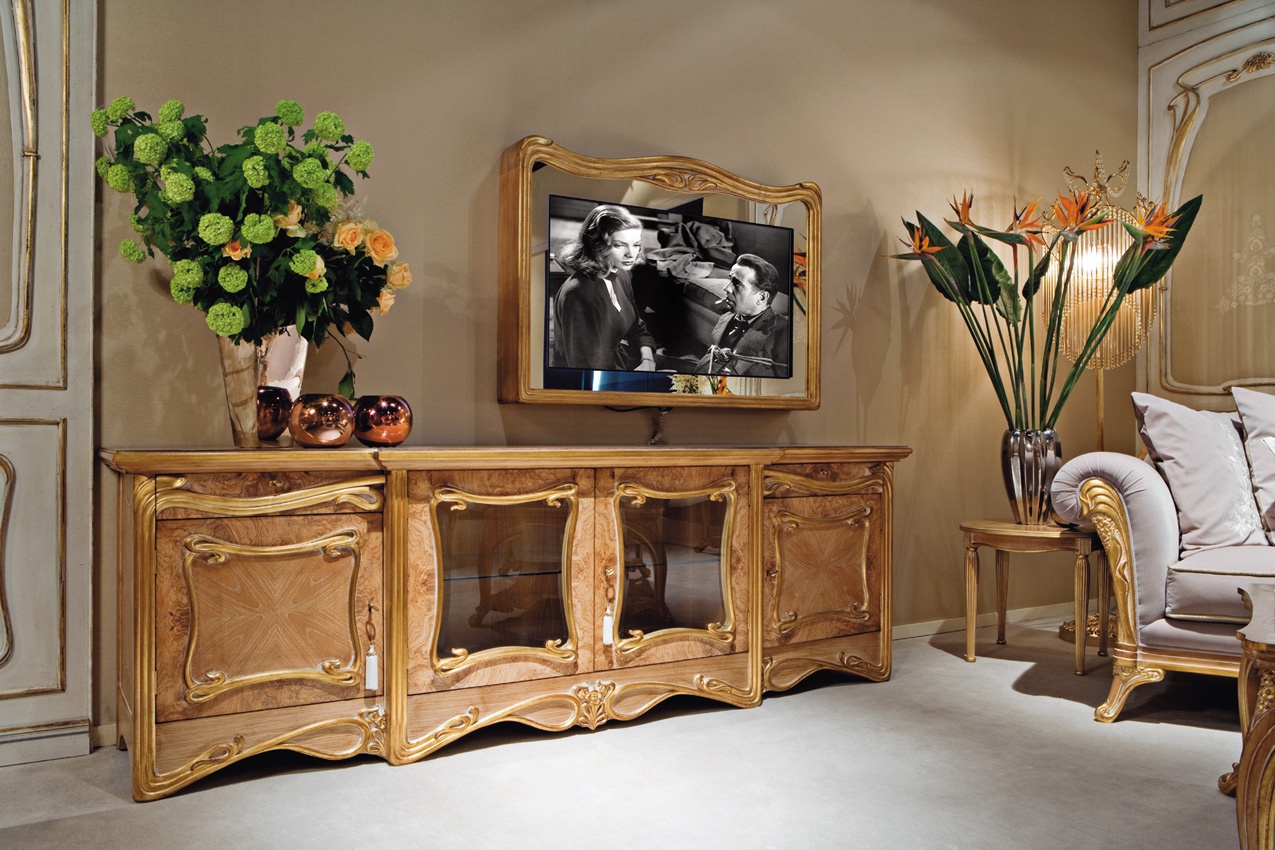The drawers under the TV Prestige from the Italian manufacturer Medea. The model is made from natural wood. The doors are decorated with floral patterns carving handmade, Central door - glass. A great choice for the interior in classic style.