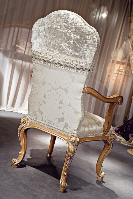 The Prestige chair from the Italian manufacturer Medea. The model is made in classic style. Model made of solid wood. The frame and legs are decorated with carved ornament. Seat and back upholstered in fabric. Colours in stock. The model is varnished.