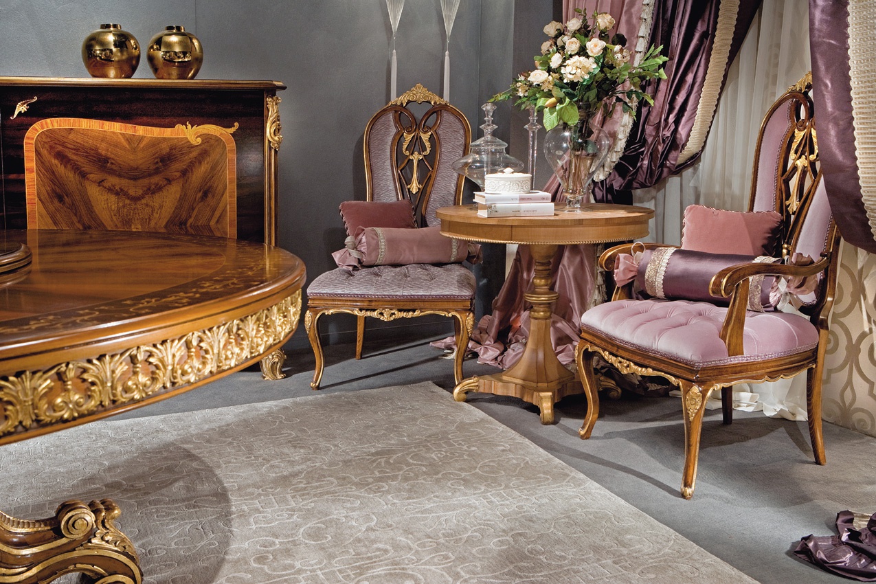 The Prestige chair from the Italian manufacturer Medea. The model is made in classic style. Model made of solid wood. The frame and legs are decorated with carved handwork Golden color. Seat and back upholstered in natural silk and decorated strap. Colours in stock.