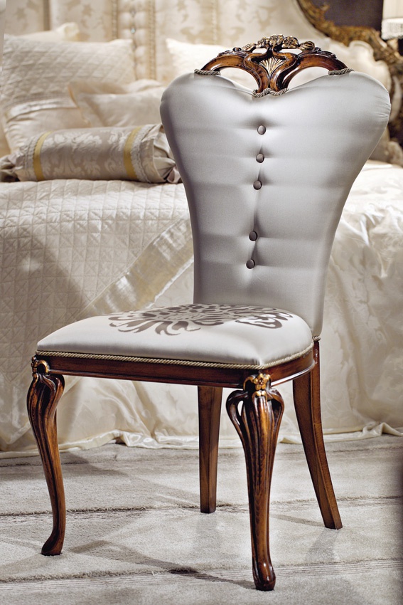 The Prestige chair from the Italian manufacturer Medea. Model made of solid wood. The frame and legs are decorated with artistic hand carved Golden color. Seat and backrest in soft fabric and adorned with buttons and strap. Colours in stock. The model is made in classic style.