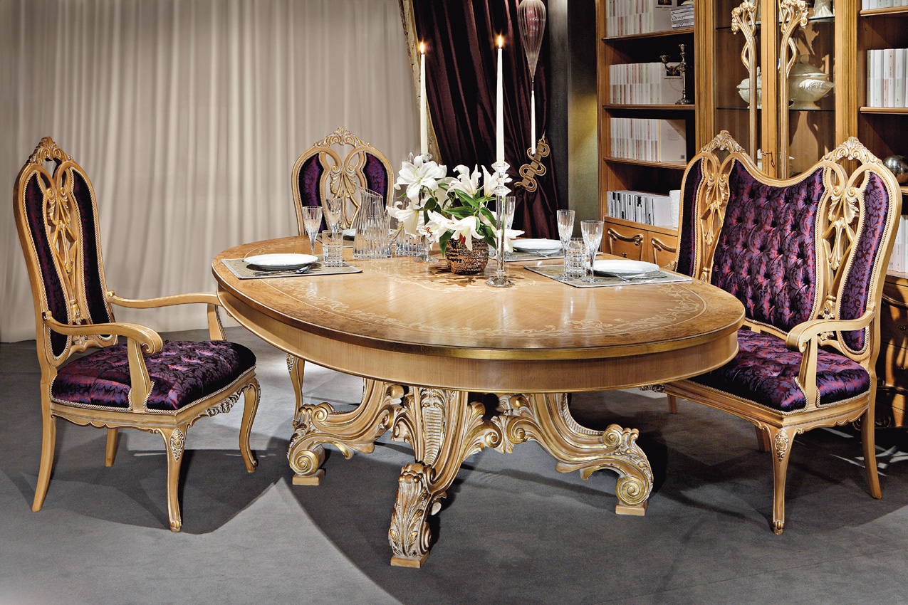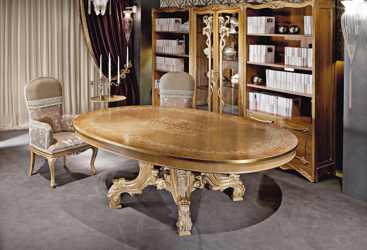 The Prestige table from the Italian manufacturer Medea. A model of oval shape made from solid wood. The table top is made of wood. Finish - lacquer from a range of companies, carved work. Table executed in classical style. Colors: brown, natural color of the wood.