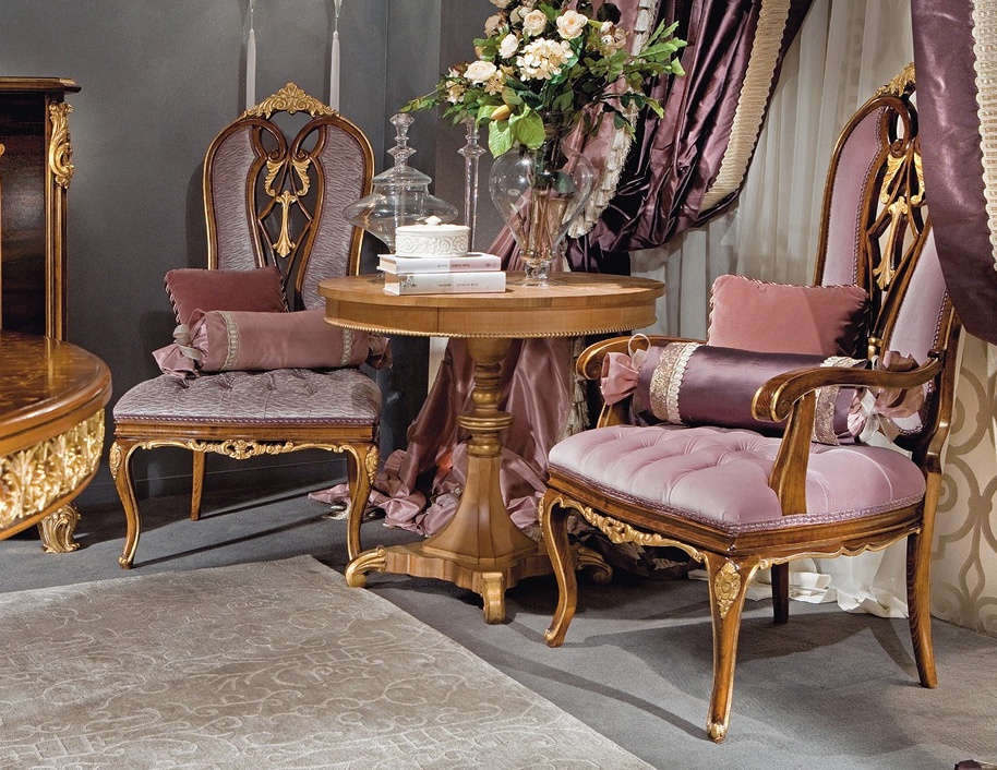 Prestige coffee table from the Italian manufacturer Medea. The frame is made from solid wood. The surface is lacquered. Table top round. Carved legs. The model is made in classic style.