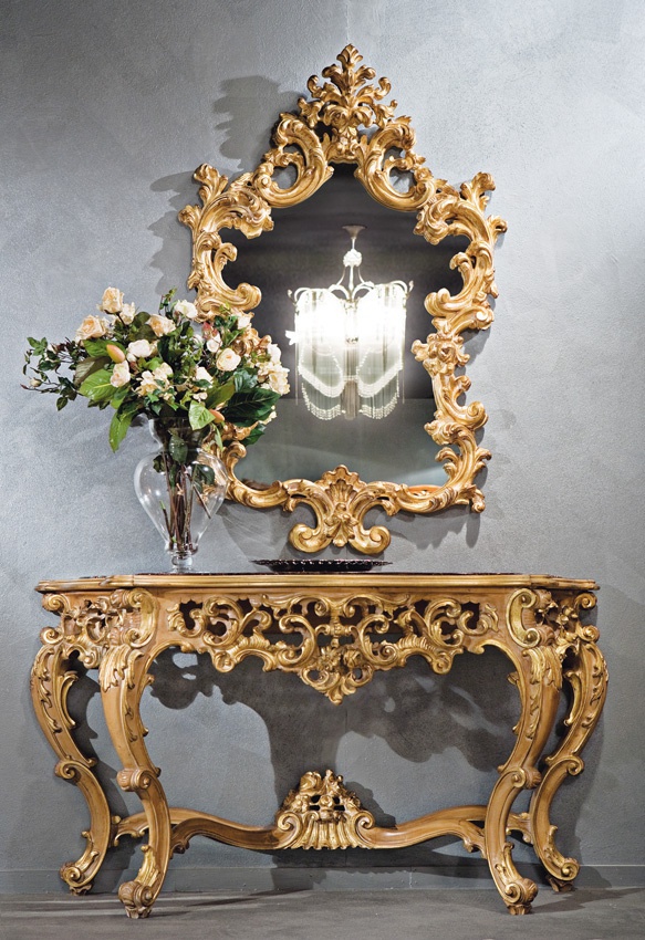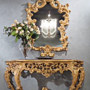 Prestige mirror from the Italian manufacturer Medea. The model is a rectangular shape made of solid wood. The coating is a gold or silver. The frame is decorated with carved handmade decor. A chic choice for interior decoration in a classic style.