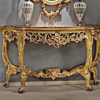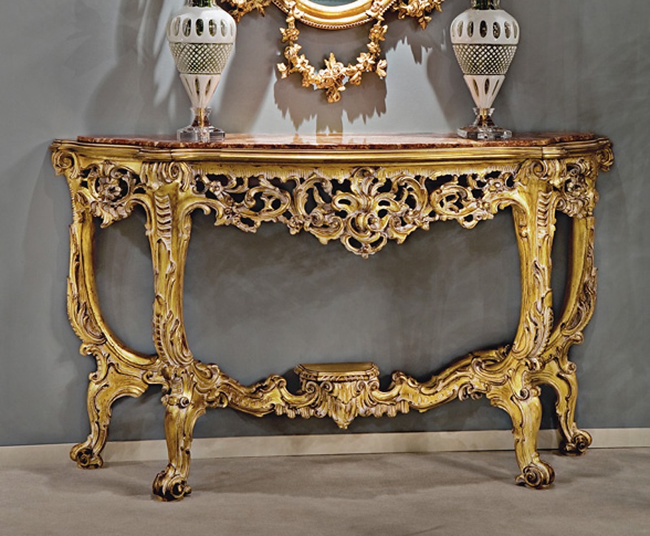 Console from Prestige Italian manufacturer of Medea. The model is rectangular. The legs are made of wood and covered in gold foil. Countertop in high gloss lacquered finish. The model is decorated with hand-carved. The console is made in a classic style.