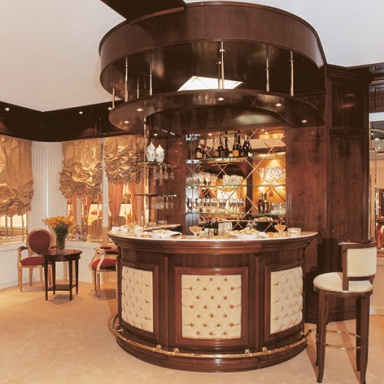 Bar with Breakfast bar. The frame is made from solid wood. The facade of the stand is decorated with three textile lining with a decorative stitch-Capito (offered in various tints from the collection of the factory). In the base - metal footstool in the living room. Includes bar unit with open glass shelves (back wall mirror), a section for glasses, built-in lighting. Metal elements painted in Golden color. The upper part of the model - decorative element in the form of two "horseshoes", separated by a metal "posts" - it follows the shape of the rack and as though hangs over the bar. Design finish built-in lights - illuminates the large space niche between "horseshoes", the little light on top of rack and bar.