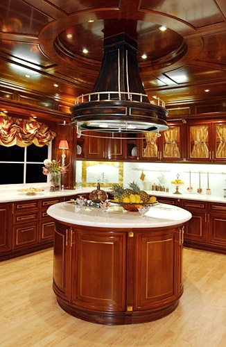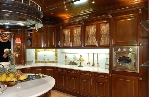 Collection of furniture for the kitchen. Made from solid wood. Includes deaf and glazed storage units, desks, island, wall panels and coffered ceilings. Classic style series decorative column support and blind embossed on the inner side of the glass doors. The facades of the deaf modules in the fringing of Golden color.