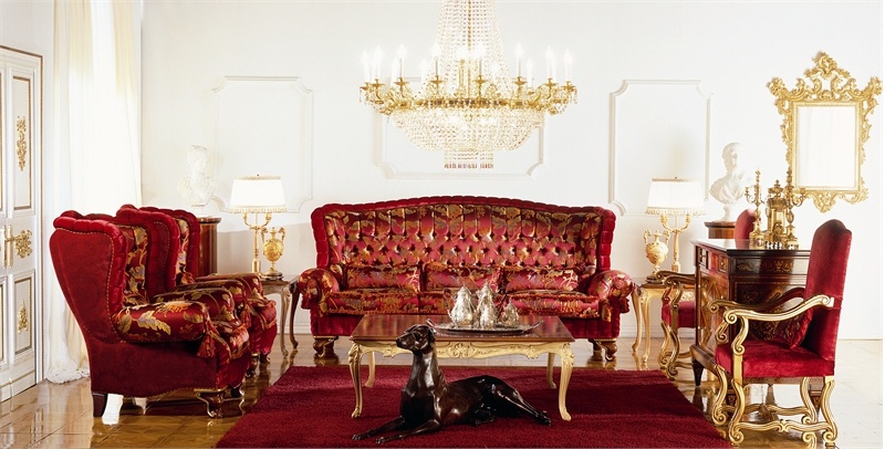 Collection of upholstered furniture filled the living room or office. Includes three seater sofa (also available in double version), chairs and a table. The material of the frame - solid wood. The front legs of sofas and armchairs carved and decorated with edge trim gold. Seat cushion removable filler - the pen (in the bulk with Allergy-free filling). Upholstery - textiles (fabric two species), decorated with stitch-Capito (on the backside). They are decorated with decorative pillows cushions.