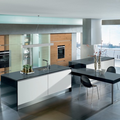 Kitchen Spaco from Austrian manufacturer Intuo. Made in the style of minimalism. The model is made of wood and MDF with veneer Sonam and plastic. Built-in appliances, lighting and extractor fan. Countertop artificial stone. Drawers and swing doors with a closing device of push-up(Push-up). Color in stock.