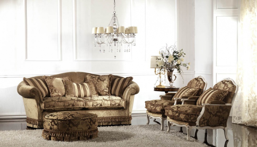 Aurora sofa set from the Italian manufacturer Keoma Salotti. The model consists of double sofa, armchairs and pouf. Carried on the frame of natural wood. Upholstery textile from the company portfolio. Legs - carved. Complement the design of decorative pillows. Set is made in a classic style.