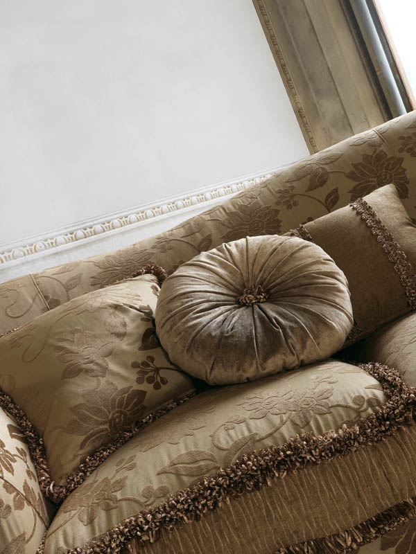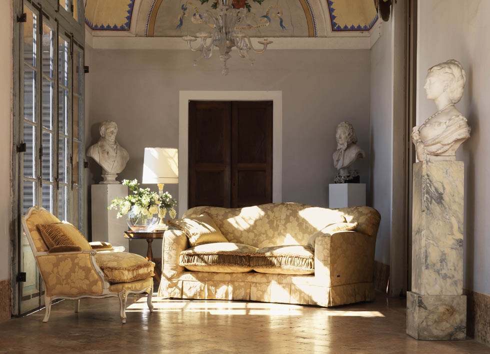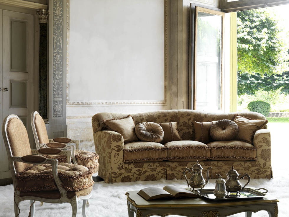 Sofa set Beatrice from the Italian manufacturer Keoma Salotti. The model is made on a frame of natural wood. Carved legs handmade. Upholstery textile from the company portfolio. Consists of sofa and armchairs. Complement the design of decorative pillows. Set is made in a classic style.
