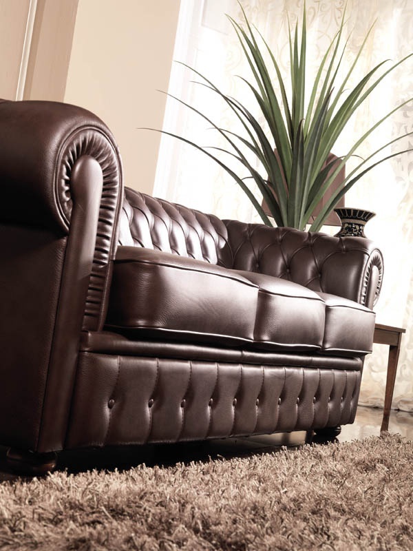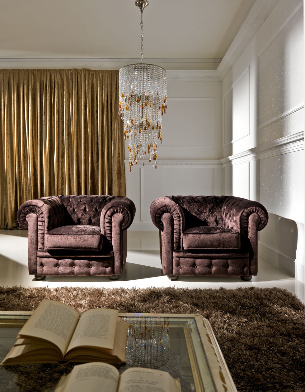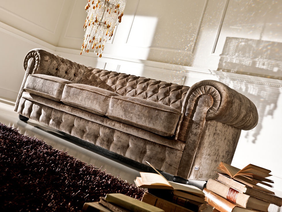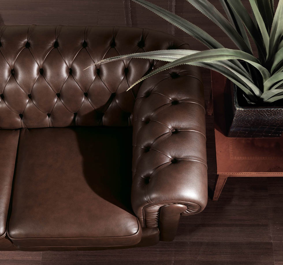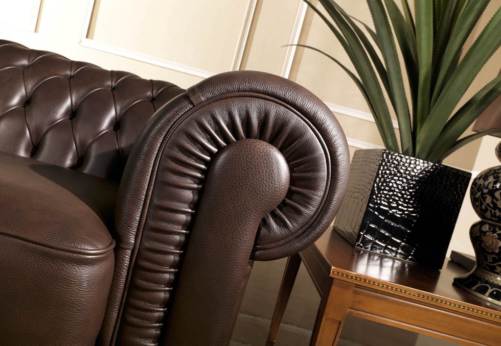 Chester sofa set from the Italian manufacturer Keoma Salotti. The model is made on a frame of natural wood. Consists of sofa and armchairs. Upholstery leather or textile from the company portfolio. The armrests are slightly wrapped. Decoration is four wheel stitch. Set is made in a classic style.