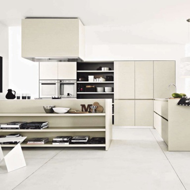 Set for the kitchen by Italian manufacturer Cesar. Includes an island, a system of lockers and open shelves. The case is made from solid oak. The facades are covered with varnish. Color - gray.