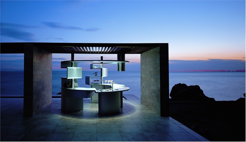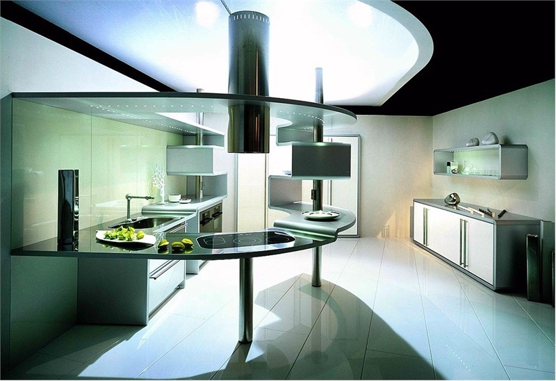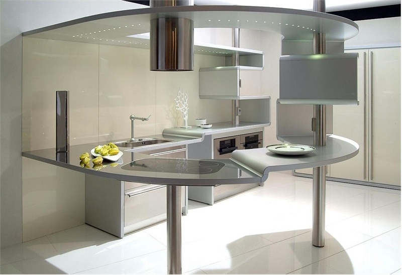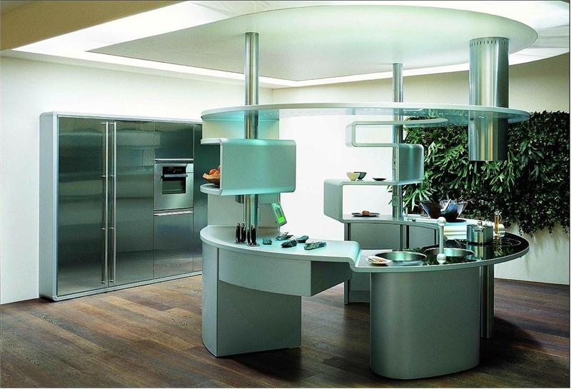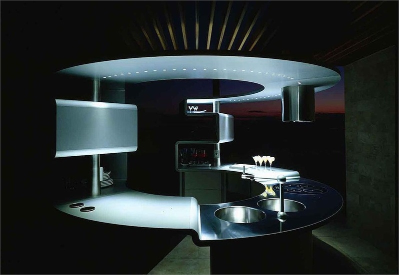 Kitchen, representing open one side of the ring. Designed By Paolo Pininfarina. In 2003, the model awarded the Good Design Award. Working surface made of stainless steel with integrated sink and hob on the aluminum frame. The whole area of the working surface illuminated by the LEDs.