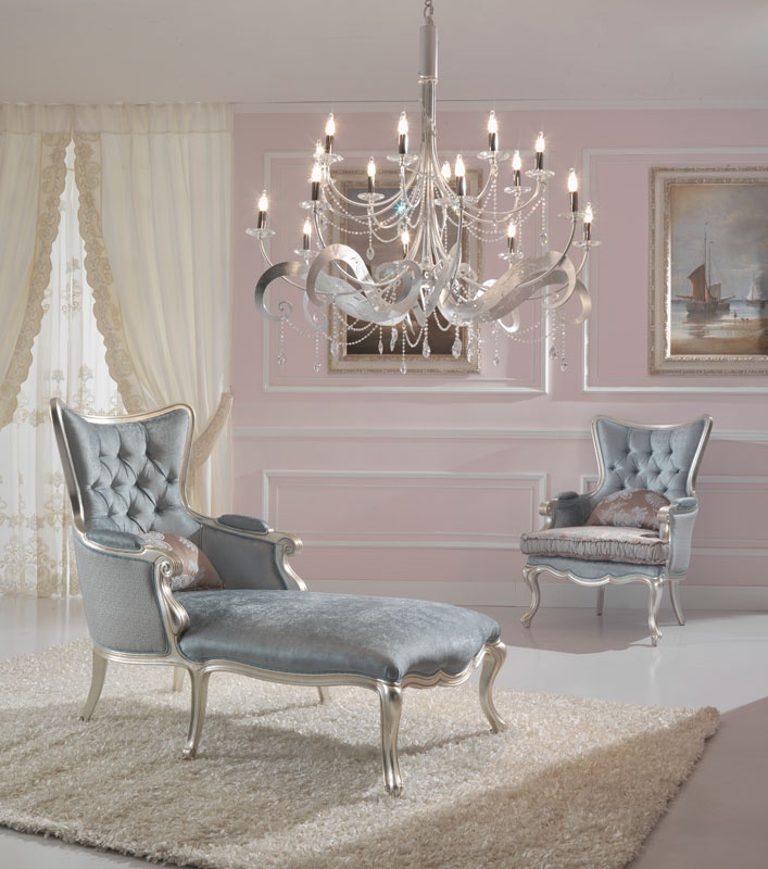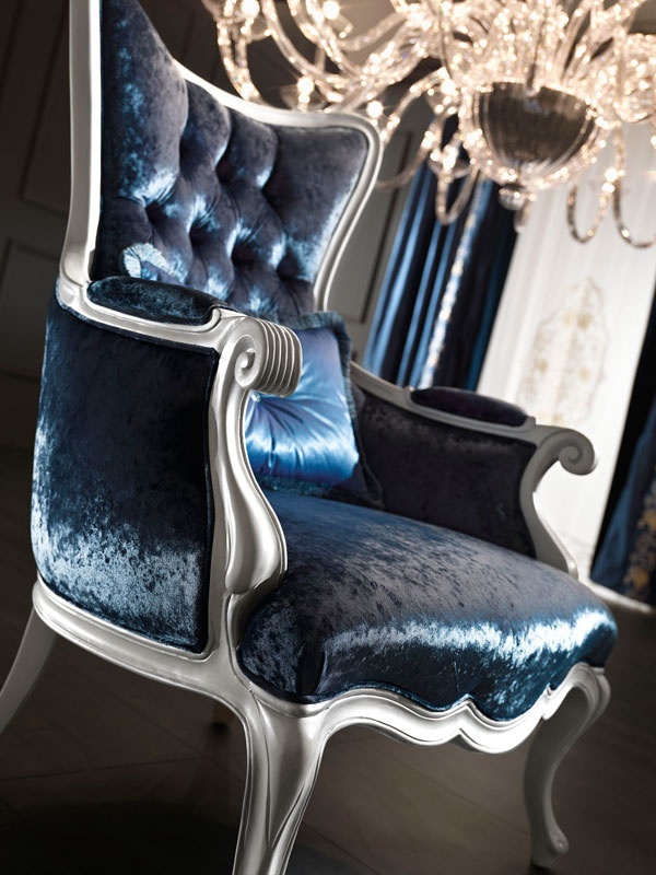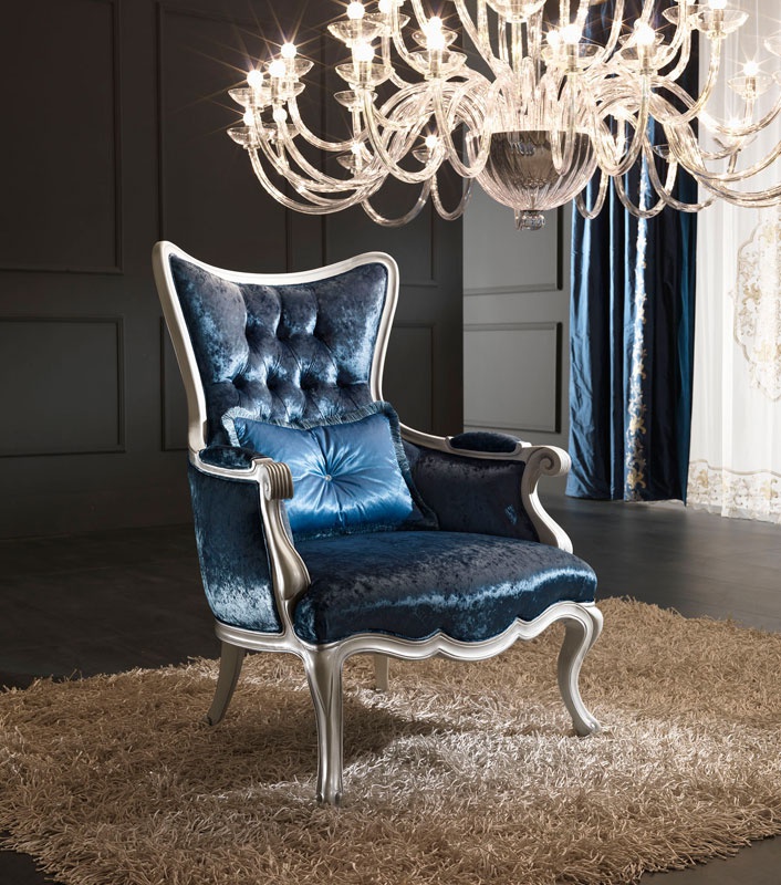 Giusy armchair from Italian manufacturer Keoma Salotti. The frame is made from natural wood with a lacquered finish. The model is decorated with handmade carving. A product with a curved backrest that becomes an armrest. The seat and back are covered with textiles. Filler - polyurethane foam. Colors offered a choice from a range of companies.